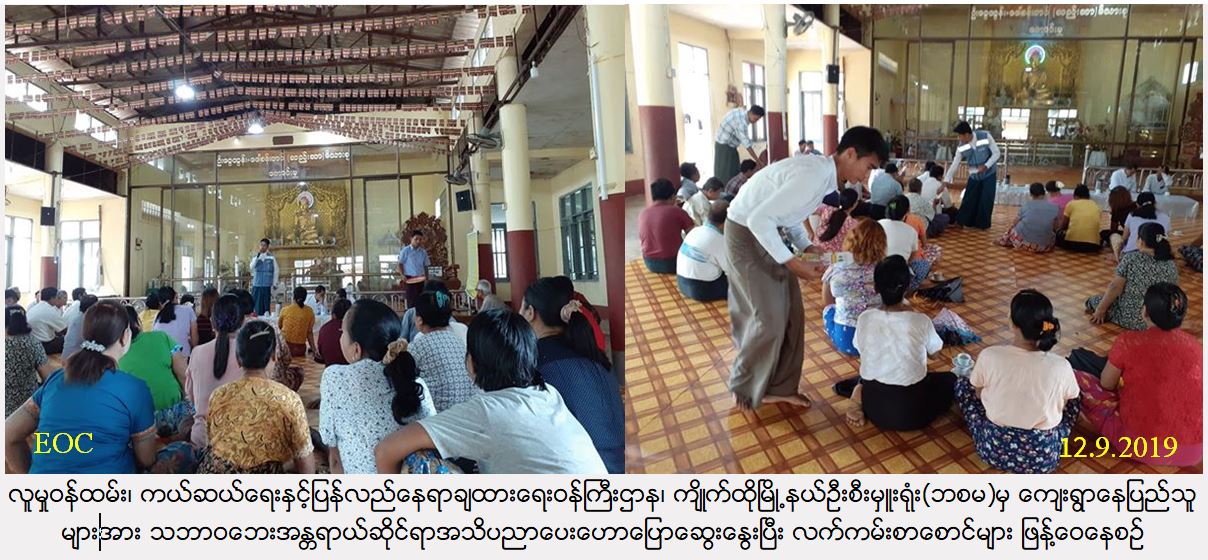 လူမှုဝန်ထမ်း၊ ကယ်ဆယ်ရေးနှင့်ပြန်လည်နေရာချထားရေးဝန်ကြီးဌာန၊ ဘေးအန္တရာယ်ဆိုင်ရာစီမံခန့်ခွဲမှုဦးစီးဌာန၊ မွန်ပြည်နယ်၊ သထုံခရိုင်၊ ကျိုက်ထိုမြို့နယ်ဦးစီးမှူးရုံးမှ တာဝန်ရှိသူများသည် (၁၂.၉.၂၀၁၉)ရက်နေ့၊ (၁၀:ဝဝ)နာရီမှ(၁၁:၃၀)နာရီထိ ကင်မွန်းချောင်းကျေးရွာအုပ်စု၊ ဓမ္မာရုံတွင် ဘေးအန္တရာယ်လျော့ပါးရေးဆိုင်ရာအသိ ပညာပေးဟောပြောဆွေးနွေးခြင်းအား ကျင်းပပြုလုပ်ခဲ့ရာ ပြည်သူလူထု (၁၅၀)ဦးခန့်တက်ရောက်ခဲ့ကြောင်း သတင်းရရှိပါသည်။