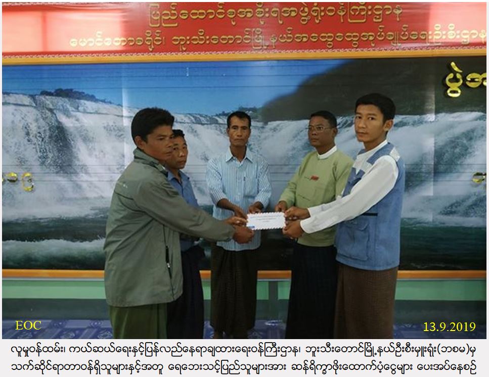 လူမှုဝန်ထမ်း၊ ကယ်ဆယ်ရေးနှင့်ပြန်လည်နေရာချထားရေးဝန်ကြီးဌာန၊ ဘေးအန္တရာယ်ဆိုင်ရာစီမံခန့်ခွဲမှုဦးစီးဌာန၊ ဘူးသီးတောင်မြို့နယ်ဦးစီးမှူးရုံးမှ ဘူးသီးတောင်မြို့နယ်အတွင်း မိုးသည်းထန်စွာရွာသွန်းမှုကြောင့် ငရန့်ချောင်းကျေးရွာအုပ်စု၊ တောင်ဘဇာ(နတလ)ကျေးရွာမှ ရေဘေးသင့်ပြည်သူ အိမ်ထောင်စု (၈၈)စု၊ လူဦးရေ (၄၈၈)ဦးအတွက် ဆန်ရိက္ခာ ၇ရက်စာဖိုးထောက်ပံ့ငွေ (၁၀၂၄၈၀ဝိ/)အား (၁၃.၉.၂၀၁၉)ရက်နေ့တွင် ဘူးသီးတောင်မြို့နယ်၊ အထွေထွေအုပ်ချုပ်ရေးဦးစီးဌာနရုံးခန်းမ၌ ဘူးသီးတောင်မြို့နယ်၊ မြို့နယ်အုပ်ချုပ်ရေးမှူး ဦးကျော်မင်းထွန်းနှင့်အတူ ရေဘေးသင့်ပြည်သူများအား ထောက်ပံ့ပေးအပ်ခဲ့ကြောင်း သတင်းရရှိပါသည်။