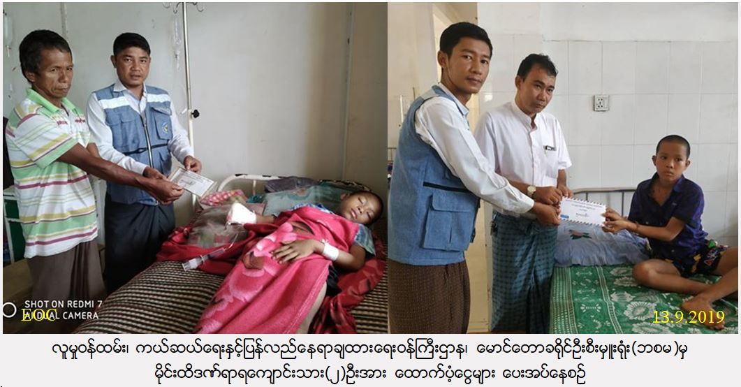 လူမှုဝန်ထမ်း၊ ကယ်ဆယ်ရေးနှင့်ပြန်လည်နေရာချထားရေးဝန်ကြီးဌာန၊ ဘေးအန္တရာယ်ဆိုင်ရာစီမံခန့်ခွဲမှုဦးစီးဌာန၊ ဘူးသီးတောင်မြို့နယ်ဦးစီးမှူးရုံမှ (၁၂-၉-၂၀၁၉)နေ့တွင် ဘူးသီးတောင်မြို့နယ် တင်းမေကျေးရွာအုပ်စု၊ တင်းမေကျေးရွာ၊ အမက(မူလွန်) စာသင်ကျောင်းမှ ကျောင်းသား(၂)ဦးမှာ မိုင်းပေါက်ကွဲမှုကြောင့် ထိခိုက်ဒဏ်ရာရရှိခဲ့ပါသဖြင့် မောင်တောပြည်သူ့ဆေးရုံတွင် ဆေးကုသမှုခံယူနေသည့် မောင်ခိုင်သ်န်းမောင်အား မောင်တောခရိုင်ဦးစီးမှူးရုံးမှ ဒဏ်ရာရထောက်ပံ့ငွေ-(၅၀၀၀၀ိ/-)အားလည်းကောင်း၊ ဘူးသီးတောင် ပြည်သူ့ဆေးရုံတွင် ဆေးကုသမှုခံယူနေသည့် မောင်ငြိမ်းချမ်းအောင်အား ဘူးသီးတောင်မြို့နယ်ဦးစီးမှူးရုံးမှ ဒဏ်ရာရထောက် ပံ့ငွေ-(၅၀၀၀၀ိ/-)အားလည်းကောင်း ၊စုစုပေါင်း ဒဏ်ရာရထောက်ပံ့ငွေ-(၁၀၀၀၀၀ိ/-)အား (၁၃-၃ -၂၀၁၉)နေ့တွင် ထောက်ပံ့ပေးခဲ့ကြောင်း သတင်းရရှိပါသည်။