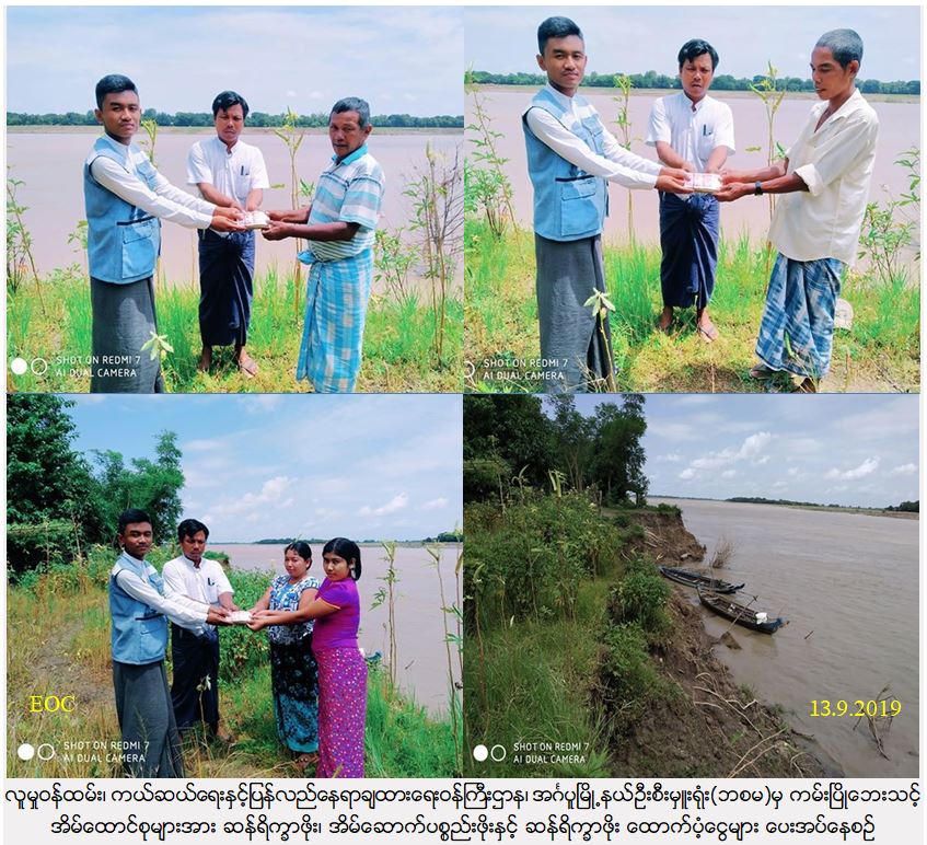 လူမှုဝန်ထမ်း၊ ကယ်ဆယ်ရေးနှင့်ပြန်လည်နေရာချထားရေးဝန်ကြီးဌာန၊ ဘေးအန္တရာယ်ဆိုင်ရာစီမံခန့်ခွဲမှုဦးစီးဌာန၊ အင်္ဂပူမြို့နယ်ဦးစီးမှူးရုံးမှ တာဝန်ရှိသူများသည် (၁၂.၉.၂၀၁၉ )ရက်နေ့တွင် သက္ကယ်ပြင်(သံ)အုပ်စု ကညင်ရိုးကျေးရွာ၌ ဖြစ်ပွားခဲ့သော ကမ်းပြိုမှုကြောင့် ဘေးလွတ်ရာသို့ ပြောင်းရွှေ့ကြရသောနေအိမ်( ၇)လုံးအတွက် အိမ်ဆောက်ပစ္စည်းရန်ပုံငွေ (၇၀၀၀၀ဝိ/-)၊ အိမ်ထောင်စု(၇)စုမှ လူဦးရေ (၂၄)ဦးအတွက် ဆန်ရိက္ခာ(၇)ရက်စာ (၅၀၄၀ဝိ/-)၊ စုစုပေါင်း ရန်ပုံငွေ (၇၅၀၄၀ဝိ/-) အား (၁၃.၉.၂၁၀၉)ရက်နေ့ (၁၃း၀၀) နာရီအချိန်တွင် တာဝန်ရှိသူများနှင့်အတူ ဘေးဖြစ်ပွားရာဒေသသို့ သွားရောက်၍ ဘေးသင့်ပြည်သူများလက်ဝယ်သို့ ထောက်ပံ့ပေးအပ်ခဲ့ကြောင်း သတင်းရရှိပါသည်။