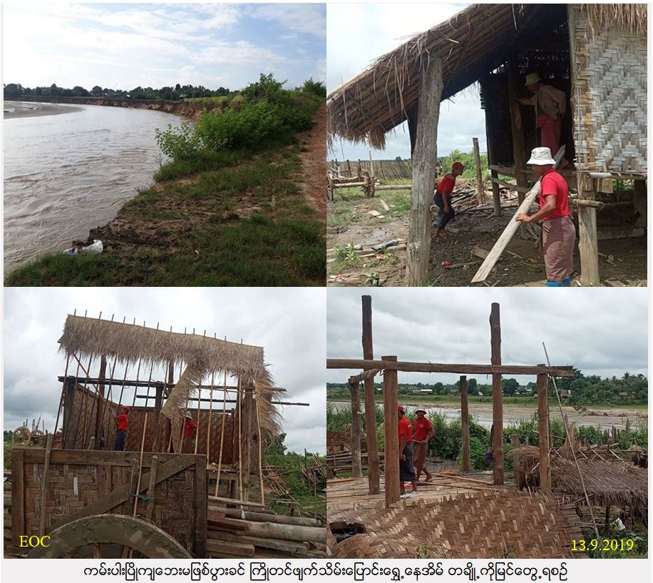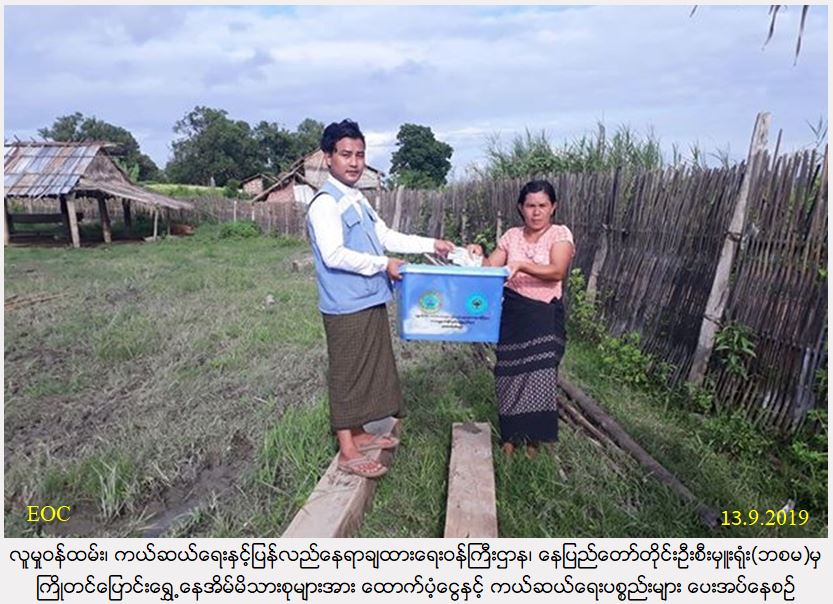 လူမှုဝန်ထမ်း၊ ကယ်ဆယ်ရေးနှင့်ပြန်လည်နေရာချထားရေးဝန်ကြီးဌာန၊ ဘေးအန္တရာယ်ဆိုင်ရာစီမံခန့်ခွဲမှုဦးစီးဌာန၊ပြည်ထောင်စုနယ်မြေ နေပြည်တော်တိုင်းဦးစီးမှူးရုံးမှ တာဝန်ရှိသူများသည် ဒက္ခိဏခရိုင်၊ လယ်ဝေးမြို့နယ်အတွင်း (၁၃-၉-၂၀၁၉) ရက်နေ့တွင် ဖြစ်ပွားခဲ့သော ကျသောင်းတောင်ကျးရွာအုပ်စု၊ ကျသောင်းတောင်ကျေးရွာတွင် ကမ်းပါးပြိုကျမှုမှကာကွယ်ရန် ကြိုတင်ဖျက်သိမ်းပြောင်းရွှေ့နေအိမ်(၁)လုံး အတွက် အိမ်ဆောက်ပစ္စည်းဖိုး(၁၀၀၀၀ဝိ/-)နှင့် လူဦးရေ (၅)ဦးအတွက် ဆန်ရိက္ခာဖိုးထောက်ပံ့ငွေ (၁၀၅၀ဝိ/-)ကျပ် စုစုပေါင်း(၁၁၀၅၀ဝိ/-)တို့အား (၁၃.၉.၂၀၁၉)ရက်နေ့(၁၆း၁၀)အချိန်တွင်တွင် ပြည်သူများလက်ဝယ်သို့ သွားရောက်ထောက်ပံ့ပေးခဲ့ကြောင်း သတင်းရရှိပါသည်။