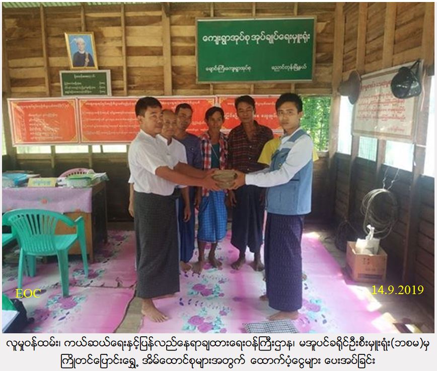 လူမှုဝန်ထမ်း၊ ကယ်ဆယ်ရေးနှင့် ပြန်လည်နေရာချထားရေးဝန်ကြီးဌာန၊ ဘေးအန္တရာယ်ဆိုင်ရာစီမံခန့်ခွဲမှုဦးစီးဌာန၊ မအူပင်ခရိုင်ဦးစီးမှူးရုံးမှ တာဝန်ရှိသူများသည် မအူပင်ခရိုင်၊ ပန်းတနော်မြို့နယ်၊ မြစ်ဝကျေးရွာအုပ်စု၊ သံပုရာချောင်းကျေးရွာ၌ (၁၂-၉-၂၀၁၉)ရက်နေ့တွင် ဖြစ်ပွားသော ကမ်းပြိုဘေးကြောင့် ကြိုတင်ရွှေ့ပြောင်းဖျက်သိမ်းနေအိမ် (၁၆)လုံး အိမ်ထောင်စု (၁၆)စုမှ လူဦးရေ (၈၀)ဦးအတွက် အိမ်ဆောက်ပစ္စည်းဖိုး (၁၆၀၀ဝဝဝိ/-)၊ ဆန်ရိက္ခာ(၇)ရက်စာရန် ပုံငွေ (၁၆၈၀၀ဝိ/-)၊ စုစုပေါင်းရန်ပုံငွေ (၁၇၆၈၀၀ဝိ/-) အား (၁၃-၉-၂၀၁၉) ရက်နေ့ (၁၃း၂၅)နာရီ အချိန်တွင် ကျေးရွာအုပ်ချုပ်ရေးမှူး၊ ရပ်မိရပ်ဖများ၏ ရှေ့မှောက်၌ ဘေးသင့်ပြည်သူများ လက်ဝယ်အရောက် ထောက်ပံ့ပေးအပ်ခဲ့ကြောင်း သတင်းရရှိပါသည်။