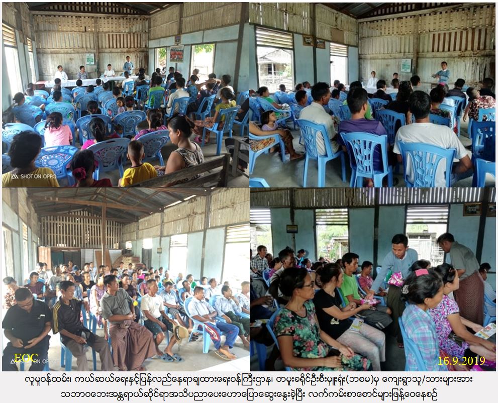 လူမှုဝန်ထမ်း၊ ကယ်ဆယ်ရေးနှင့်ပြန်လည်နေရာချထားရေးဝန်ကြီးဌာန၊ ဘေးအန္တရာယ်ဆိုင်ရာစီမံခန့်ခွဲမှုဦးစီးဌာန၊ တမူးခရိုင်ဦးစီးမှူးရုံးမှ တာဝန်ရှိသူများသည် ခရိုင်ပြန်ကြားရေးနှင့်ပြည်သူ့ဆက်ဆံရေးဦးစီးဌာနနှင့်ပူးပေါင်း၍ (၁၆-၉-၂၀၁၉)ရက်နေ့ နေ့လည် (၁၂)နာရီချိန်မှ ၁၃း၃၀အချိန်ထိ တမူးမြို့နယ်၊ ခမ်းပတ်မြို့၊ ကနန်ကျေးရွာတွင် ကျေးရွာအုပ်ချုပ်ရေးမှူးနှင့်အတူ ကျေးရွာသူ/သား(၆၅)ဦးခန့်အား သဘာဝဘေးအန္တရာယ်အသိပညာပေးဟောပြော ဆွေးနွေးခဲ့ပြီး အသိပညာပေးလက်ကမ်းစာစောင်များ ဖြန့်ဝေခဲ့ကြောင်း သတင်းရရှိပါသည်။