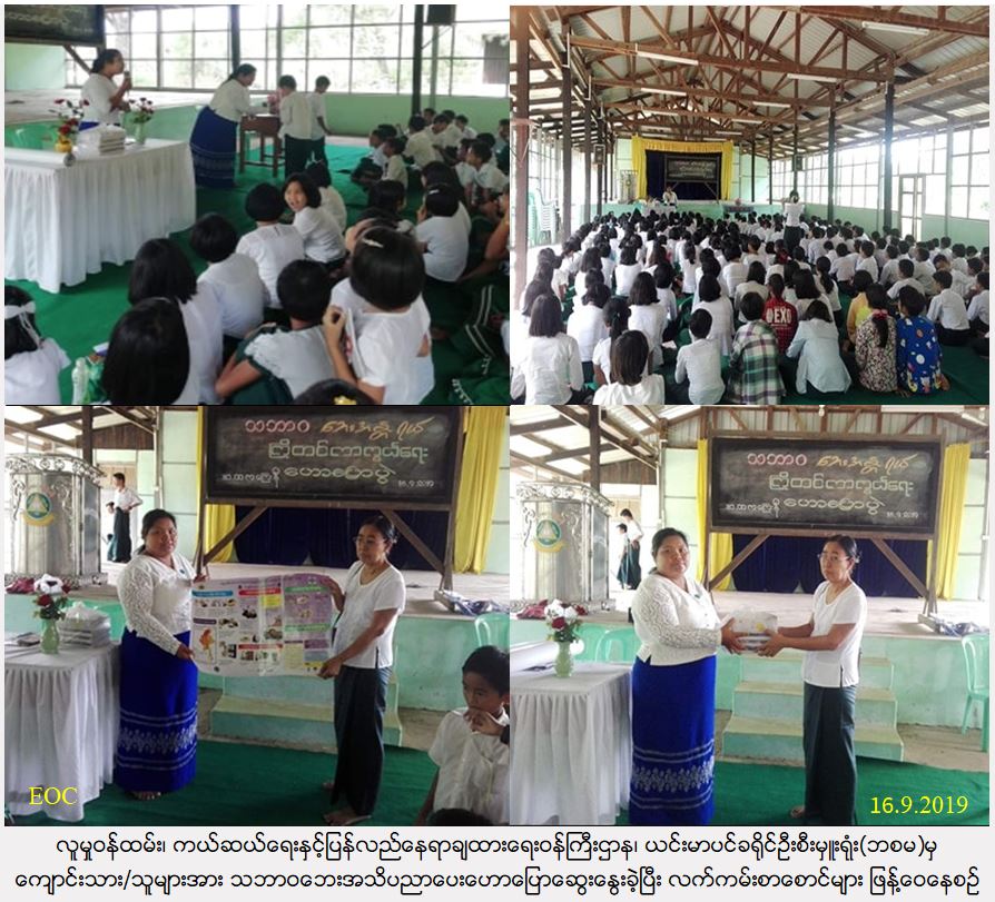 လူမှုဝန်ထမ်း၊ ကယ်ဆယ်ရေးနှင့်ပြန်လည်နေရာချထားရေးဝန်ကြီးဌာန၊ ဘေးအန္တရာယ်ဆိုင်ရာစီမံခန့်ခွဲမှုဦးစီးဌာန၊ ယင်းမာပင်ခရိုင်ဦးစီးမှူးရုံး တာဝန်ရှိသူများမှ (၁၆-၉-၂၀၁၉) ရက်နေ့တွင် ယင်းမာပင်ခရိုင်၊ ဆားလင်းကြီးမြို့နယ်၊ မိုင်း အထက်တန်းကျောင်းတွင်း ကျောင်းသား/သူ (၂၅၀)ဦး၊ ဆရာ/မ (၁၀)ဦးအား သဘာဝဘေးအသိပညာပေးဟောပြောပွဲ ပြုလုပ်ခဲ့ကြောင်း သတင်းရရှိပါသည်။