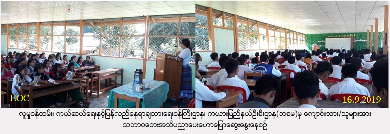 လူမှုဝန်ထမ်း၊ ကယ်ဆယ်ရေးနှင့်ပြန်လည်နေရာချထားရေးဝန်ကြီးဌာန၊ ဘေးအန္တရာယ်ဆိုင်ရာစီမံခန့်ခွဲမှုဦးစီးဌာန၊ ကယားပြည်နယ်ဦးစီးမှူးရုံးမှ (၁၆.၉.၂၀၁၉)ရက်နေ့ လွိုင်ကော်မြို့ အ.ထ.က(၇) ကျောင်းရှိ ကျောင်းသား / ကျောင်းသူ(၁၅၀)ဦးအား သဘာဝဘေးအန္တရာယ်ဆိုင်ရာ အသိပညာပေးဟောပြောပွဲပြုလုပ်ခဲ့ဲပြီး လက်ကမ်းစာစောင်များဖြန့်ဝေခဲ့ကြောင်း သတင်းရရှိပါသည်။