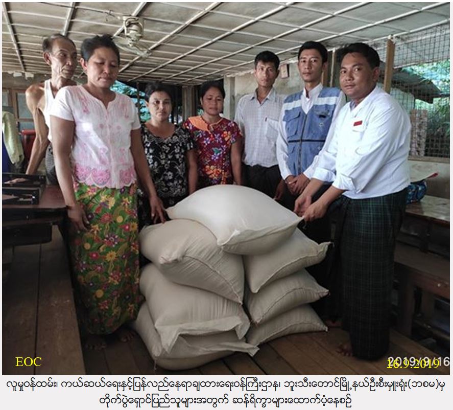 လူမှုဝန်ထမ်း၊ ကယ်ဆယ်ရေးနှင့်ပြန်လည်နေရာချထားရေးဝန်ကြီးဌာန၊ ဘေးအန္တရာယ်ဆိုင်ရာစီမံခန့်ခွဲမှုဦးစီးဌာန၊ ဘူးသီးတောင်မြို့နယ်ဦးစီးမှူးရုံးမှ ဘူးသီးတောင်မြို့၊ တောင်ရပ်ကွက်၊ ရွှေကျင်ဘုန်းတော်ကြီးကျောင်းတွင် (၁၅.၉.၂၀၁၉)ရက်နေ့တွင် ယာယီခိုလှုံနေထိုင်ရန် ရောက်ရှိလာသော တိုက်ပွဲရှောင်ပြည်သူ အိမ်ထောင်စု(၁၃)စု၊ ကျား(၁၈)ဦး၊ မ(၃၀)ဦး၊ လူဦးရေ(၄၈)ဦးအတွက် ဆန်ရိက္ခာ (၁၄)ရက်စာ ဆန်(၇)အိတ်အား (၁၆.၉.၂၀၁၉)ရက်နေ့တွင် ဘူးသီးတောင်မြို့နယ် အထွေထွေအုပ်ချုပ်ရေးဦးစီးဌာနမှတာဝန်ရှိသူများနှင့်အတူ ထောက်ပံ့ပေးအပ်ခဲ့ကြောင်း သတင်းရရှိပါသည်။