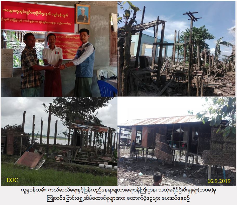 လူမှုဝန်ထမ်း၊ ကယ်ဆယ်ရေးနှင့်ပြန်လည်နေရာချထားရေးဝန်ကြီးဌာန၊ ဘေးအန္တရာယ်ဆိုင်ရာစီမံခန့်ခွဲမှုဦးစီးဌာန၊ သထုံခရိုင်ဦးစီးမှူးရုံးမှ တာဝန်ရှိသူများသည် (၁၄.၉.၂၀၁၉)ရက်နေ့၊ (၁၃း၀၀)နာရီခန့်တွင် မွန်ပြည်နယ်၊ ပေါင်မြို့နယ်၊ လက်ပံကျွန်းကျေးရွာအုပ်စု၊ ကုလားစုကျေးရွာ၌ မိုးသည်းထန်စွာရွာသွန်ပြီး ကမ်းပြိုမှုကြောင့် ကြိုတင်ဖျက်သိမ်းပြောင်းရွှေ့ခဲ့ရသည့် လူနေအိမ် (၃)လုံးအတွက် အိမ်ဆောက်ပစ္စည်းဖိုးငွေ(၃၀၀,ဝဝိ/-)၊ လူဦးရေ(၁၄)ဦးတို့အတွက်(၇)ရက်စာဆန်ဖိုးငွေ(၂၉,၄၀ဝိ/-)၊ စုစုပေါင်း(၃၂၉,၄၀ဝိ/-)အား (၁၆.၉.၂၀၁၉)ရက်နေ့တွင် ထောက်ပံ့ပေးခဲ့ကြောင်း သတင်းရရှိပါသည်။