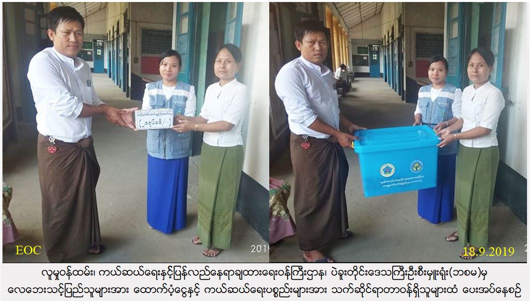 လူမှုန်ထမ်း၊ ကယ်ဆယ်ရေးနှင့်ပြန်လည်နေရာချထားရေးဝန်ကြီးဌာန၊ ဘေးအန္တရာယ်ဆိုင်ရာစီမံခန့်ခွဲမှုဦးစီးဌာန၊ ပဲခူးတိုင်းဒေသကြီးဦးစီးမှူးရုံး(ဘစမ)မှ (၁၅.၉.၂၀၁၉) ရက်နေ့ တောင်ငူခရိုင်၊ ဖြူးမြို့နယ်၊ မိဿ လင်းကျေးရွာအုပ်စု၊ ကျေးရွာ(၃)ရွာတို့တွင်ဖြစ်ပွားသော လေဘေးမှ ပြိုလဲနေအိမ်(၁)လုံးအတွက် အိမ်ဆောက်ပစ္စည်းဖိုးထောက်ပံငွေ(၁၀၀၀၀ဝိ/-)ကျပ်နှင့် ပြိုလဲနေအိမ်(၁)လုံးနှင့် အမိုးလန်နေအိမ်(၈)လုံးတို့မှ လူဦးရေ(၅၆)ဦးတို့အတွက် ဆန်ရိက္ခာ(၇)ရက်စာဖိုးထောက်ပံ့ငွေ(၁၁၇၆၀ဝိ/-)၊ စုစုပေါင်းထောက်ပံ့ငွေ (၂၁၇၆၀၀)ကျပ်နှင့် ပြိုလဲနေအိမ်(၁)လုံးအတွက် ကယ်ဆယ်ရေးပစ္စည်း ပလပ်စတစ်ပုံးပါ (၁၅)မျိုးတို့အား (၁၈.၉.၂၀၁၉)ရက်နေ့တွင် သွားရောက်ထောက်ပံ့ပေးခဲ့ကြောင်း သတင်းရရှိပါသည်။