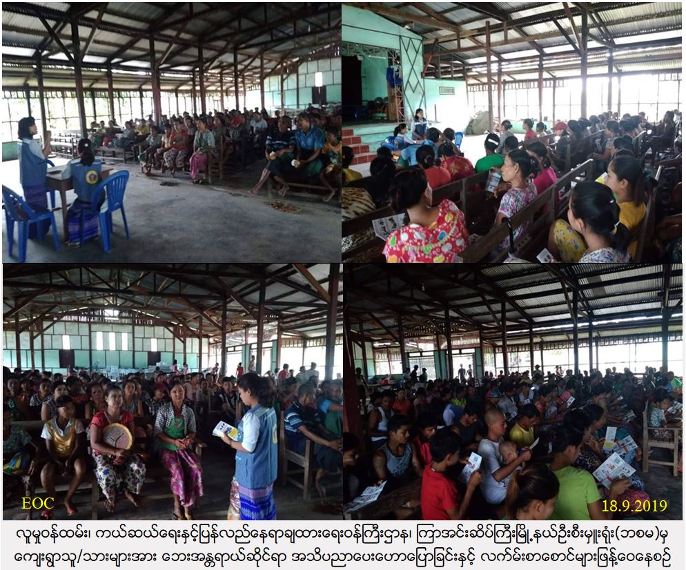 လူမှုဝန်ထမ်း၊ ကယ်ဆယ်ရေးနှင့်ပြန်လည်နေရာချထားရေးဝန်ကြီးဌာန၊ ဘေးအန္တရာယ်ဆိုင်ရာစီမံခန့်ခွဲမှုဦးစီးဌာန ကြာအင်းဆိပ်ကြီးမြို့နယ်ဦးစီးမှူးရုံးမှ တာဝန်ရှိသူများသည် (၁၈.၉.၂၀၁၉)ရက်နေ့ နေ့လည် (၁၃း၀၀)အချိန်တွင် ကြာအင်းဆိပ်ကြီးမြို့နယ် အမှတ် (၆)ရပ်ကွက် ကရင်နှစ်ခြင်းအသင်းတော်(church)ကျောင်း၌ ကျေးရွာသူ/ကျေးရွာသား အင်အား (၂၀၀)ဦးအား သဘာဝဘေးအန္တရာယ်ဆိုင်ရာအသိပညာပေးဟောပြောခြင်း၊ ဌာနနှင့်ပတ်သတ်သောသိကောင်းစရာများ၊ ရေဘေး၊ မုန်တိုင်းဘေး မိုးကြိုးဘေးအန္တရာယ်များနှင့်ပတ်သက်၍ ဆောင်ရန်ရှောင်ရန်အချက်များ ဟောပြောခဲ့ပြီး လက်ကမ်းစာစောင်များ ဗီနိုင်းပိုစတာများကိုလည်းပေးအပ်ခဲ့ကြောင်း သတင်းရရှိပါသည်။