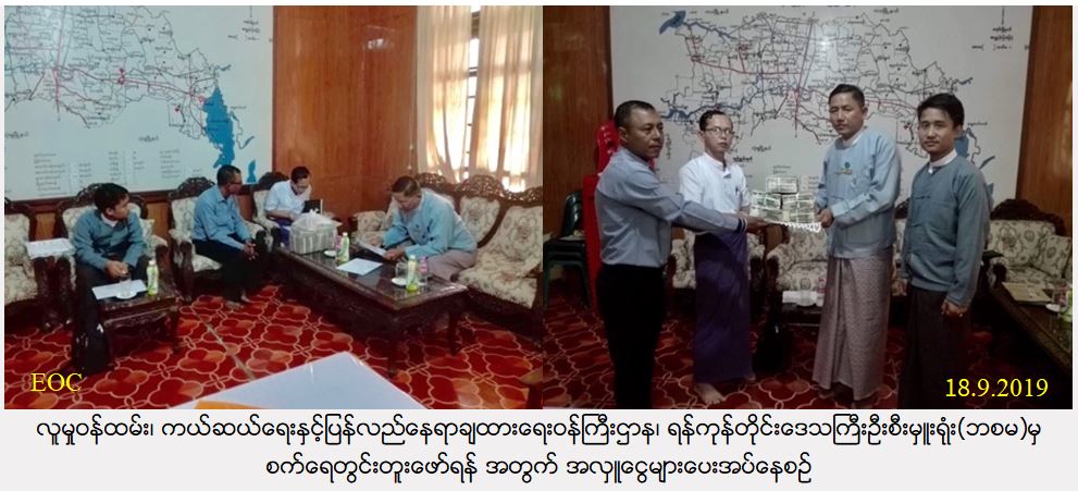 လူမှုဝန်ထမ်း၊ ကယ်ဆယ်ရေးနှင့်ပြန်လည်နေရာချထားရေးဝန်ကြီးဌာန၊ ဘေးအန္တရာယ်ဆိုင်ရာစီမံခန့်ခွဲမှုဦးစီးဌာန၊ ရန်ကုန်တိုင်းဒေသကြီးဦးစီးမှူးရုံးမှ (၁၈-၉-၂၀၁၉) ရက်နေ့တွင် ခရမ်းမြို့ ရပ်ကွက် (၂) ၊ရပ်ကွက်(၃)တို့တွင် ၄ လက်မစက်ရေတွင်းတူးဖော်ရန်နှင့် ရေကန်၊ စက်ရေတွင်းအမိုး၊ အကာအပါအဝင်ဆောက်လုပ်ရန်အတွက် ထောက်ပံ့ငွေကျပ် (၁၆,၁၀၀,၀၀ဝိ/-) အား မြို့နယ်အုပ်ချုပ်ရေးမှူး၊ စည်ပင်သာယာအုပ်ချုပ်ရေးမှူးနှင့် ရပ်ကွက်အုပ်ချုပ်ရေးမှူးများထံသို့ စနစ်တစ်ကျလွှဲပြောင်းပေးခဲ့ပါကြောင်းနှင့် ဘဏ္ဍာရေးနှစ်အတွင်းလုပ်ငန်းပြီးစီးအောင် ဆောင်ရွက်ရေးညှိနှိုင်းဆောင်ရွက်ခဲ့ကြောင်း သတင်းရရှိပါသည်။
