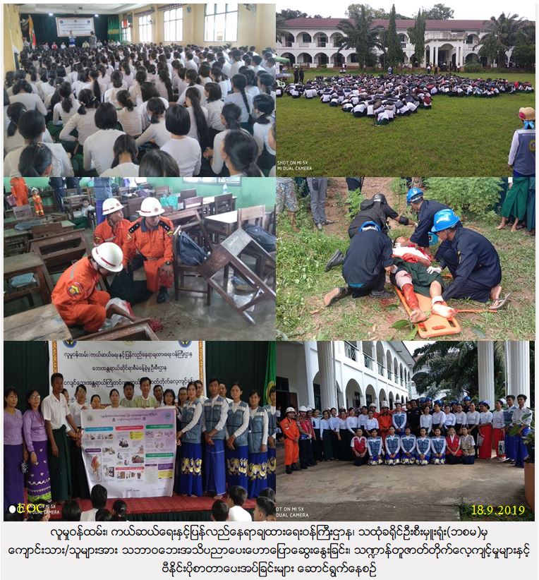 လူမှုဝန်ထမ်း၊ ကယ်ဆယ်ရေးနှင့် ပြန်လည်နေရာချထားရေးဝန်ကြီးဌာန၊ ဘေးအန္တရာယ်ဆိုင်ရာစီမံခန့်ခွဲမှုဦးစီးဌာန၊ သထုံခရိုင်ဦးစီးမှူးရုံးမှ တာဝန်ရှိသူများသည် (၁၈-၉-၂၀၁၉)ရက်နေ့ မွန်ပြည်နယ်၊ သထုံမြို့၊ အမှတ်(၂)အခြေခံ ပညာအထက်တန်းကျောင်း၌ ငလျင်ဘေး အန္တရာယ်ဇာတ်တိုက်လေ့ကျင့်ခန်းအား ကျောင်းသား/သူ(၇၀၀)ဦးဖြင့် ကျင်းပပြုလုပ်ခဲ့ရာ အဆိုပါ ဇာတ်တိုက်လေ့ကျင့်ခြင်းတွင် ခရိုင်နှင့် မြို့နယ်သဘာဝဘေးစီမံခန့်ခွဲမှုအဖွဲ့၊ အ.ထ.က(၂)မှဆရာ/ဆရာမများ၊ မိခင်နှင့်ကလေးစောက်ရှောက်ရေးအသင်းကြက်ခြေနီအဖွဲ့နှင့် Rescue အဖွဲ့များ၊ စုစုပေါင်း(၁၀၀)ဦး စုစုပေါင်းအင်အား (၈၀၀)ဦးခန့်ပါဝင်ဆောင်ရွက်ခဲ့ကြောင်း သတင်းရရှိပါသည်။