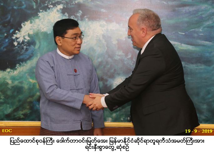 ထို့နောက်မြန်မာနိုင်ငံဆိုင်ရာ တူရကီသံအမတ်ကြီးH.E KeremDivanhoglu ဦးဆောင်သော ကိုယ်စားလှယ်များနှင့် တွေ့ဆုံရာတွင်ရခိုင်ပြည်နယ်တည်ငြိမ်အေးချမ်းရေးနှင့်လူမှုစီးပွားဘဝဖံ့ွဖြိုးတိုးတက်ရေးအတွက်ဆောင်ရွက်နေမှုနောက်ဆုံးအခြေအနေများ၊နေရပ်စွန့်ခွာသူများပြန်လည်လက်ခံရေးလုပ်ငန်းစဉ်များတွင်မြန်မာ-ဘင်္ဂလားဒေ့ရှ်နှစ်နိုင်ငံသဘောတူညီချက်နှင့် အညီမြန်မာဘက်မှဆောင်ရွက်နေမှုများနှင့်အာဆီယံနိုင်ငံများမှပူးပေါင်းဆောင်ရွက်နေမှုများ၊ရခိုင်ပြည်နယ်ဆိုင်ရာအကြုံပြုချက်များအပေါ်အကောင်အထည်ဖော်ဆောင်ရွက်ရေးကော်မတီအနေဖြင့်သက်ဆိုင်ရာဝန်ကြီးဌာနများအလိုက်လုပ်ငန်းစီမံချက်များဖြင့်စီစဉ်ဆောင်ရွက်နေမှုများ၊ “National Strategy for Closure of the Camp” နှင့်ပတ်သက်၍ အတည်ပြုပြီးဖြစ်၍ အကောင်အထည်ဖော်ရေးလုပ်ငန်းစဉ်များဆက်လက်ရေးဆွဲဆောင်ရွက်မည်ဖြစ်ကြောင်း၊ ပြည်တွင်းနေရပ်စွန့်ခွာသူများ ပြန်လည် နေရာချထားရေးနှင့် ယာယီခိုလှုံရာစခန်းများပိတ်သိမ်းရေးဆိုင်ရာအမျိုးသားအဆင့်မဟာဗျူဟာနှင့်ပတ်သက်၍ အတည်ပြုပြီး ဖြစ်၍ အကောင်အထည်ဖော်ရေးလုပ်ငန်းစဉ် (Action Plan) များဆက်လက်ရေးဆွဲဆောင်ရွက်မည့်အခြေအနေများ၊ တူရကီနိုင်ငံအနေဖြင့် ပူးပေါင်းဆောင်ရွက်နိုင်မည့်အခြေအနေများနှင့် စပ်လျဉ်း၍တွေ့ဆုံဆွေးနွေးခဲ့ကြကြောင်း သတင်း ရရှိပါသည်။