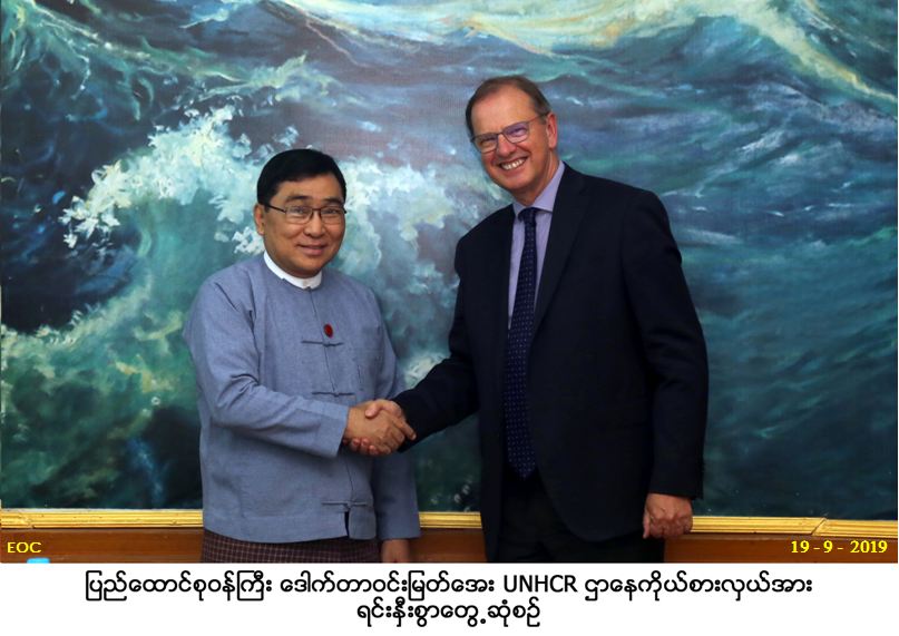 UNHCR ဌာနေကိုယ်စားလှယ် Mr. Johan Cels ဦးဆောင်သောအဖွဲ့နှင့်တွေ့ဆုံရာတွင် ဘင်္ဂလားဒေ့ရှ်နိုင်ငံ ဘက်သို့ ရောက်ရှိနေသော နေရပ်စွန့်ခွာသူများအားပြန်လည်လက်ခံရေး ဆောင်ရွက်နေမှုနောက်ဆုံးအခြေအနေများ၊ ပြန်လည်လက်ခံ ရေးလုပ်ငန်းစဉ်များတွင်အာဆီယံနိုင်ငံများနှင့်ပူးပေါင်းဆောင်ရွက်နေမှုများ၊ဘင်္ဂလားဒေ့ရှ်နိုင်ငံကော့ဘဇားသို့မြန်မာနိုင်ငံမှအဆင့်မြင့်အရာရှိများ၊အာဆီယံနိုင်ငံများမှကိုယ်စားလှယ်များသွားရောက်ခဲ့ပြီးနောက်သတင်းအချက်အလက်ဝေမျှမှုအခြေအနေများ၊ရှေ့ဆက်ဆောင်ရွက်မည့်လုပ်ငန်းစဉ်များနှင့် UNHCR နှင့်ပူးပေါင်းဆောင်ရွက်နိုင်မည့် အခြေအနေများ၊ ဆွစ်ဇာလန်နိုင်ငံ၊ ဂျီနီဗာ မြို့တွင် အောက်တိုဘာလဆန်းတွင်ကျင်းပမည့် (၇၀)ကြိမ်မြောက် Annual Plenary Session of the Executive Committee of the High Commissioner’s Programmer (Excom) သို့မြန်မာကိုယ်စားလှယ်အဖွဲ့တက်ရောက်မည့်အခြေအနေနှင့် ကုလသမဂ္ဂဒုက္ခသည်များဆိုင်ရာ မဟာမင်းကြီးနှင့် တွေ့ဆုံဆွေးနွေးမည့် အခြေအနေများနှင့်စပ်လျဉ်း၍ တွေ့ဆုံဆွေးနွေးခဲ့ကြ ပါသည်။