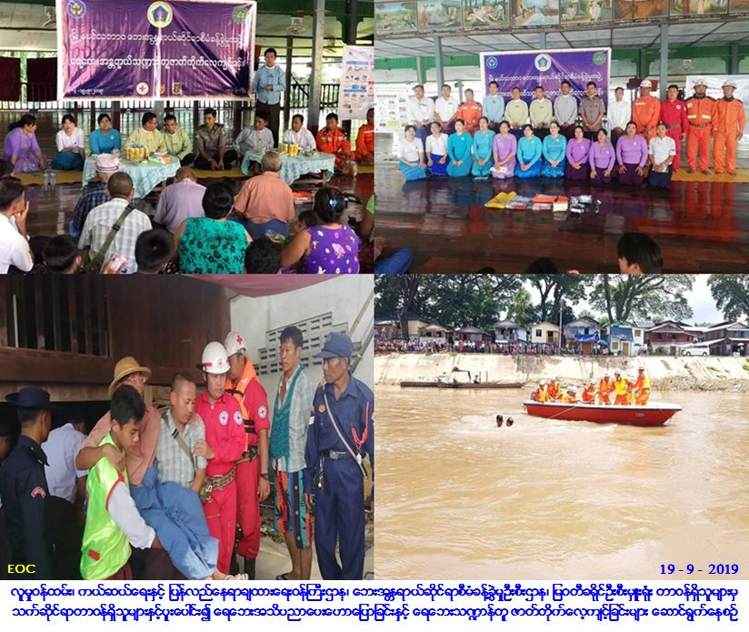 လူမှုဝန်ထမ်း၊ ကယ်ဆယ်ရေးနှင့် ပြန်လည်နေရာချထားရေးဝန်ကြီးဌာန၊ ဘေးအန္တရာယ်ဆိုင်ရာစီမံခန့်ခွဲမှုဦးစီးဌာန၊ မြဝတီခရိုင်ဦးစီးမှူးရုံးမှ တာဝန်ရှိသူများသည် (၁၉-၉-၂၀၁၉) ရက်နေ့၊ (၁၂း၃၀) နာရီအချိန်တွင် မြဝတီခရိုင် အထွေထွေအုပ်ချုပ်ရေးဦးစီးဌာန၊ မြဝတီမြို့နယ် သဘာဝဘေးစီမံခန့်ခွဲမှုအဖွဲ့၊ ခရိုင်မီးသတ်ဦးစီးမှူးရုံး၊ မိခင်နှင်ကလေးစောင့်ရှောက်ရေး၊ အမျိုးသမီးရေးရာ၊ ကြက်ခြေနီတပ်ဖွဲ့၊ မြဝတီမြို့ လူမှုကယ်ဆယ်ရေးအသင်း (MR)တို့နှင့်ပူးပေါင်း၍ မြဝတီမြို့၊ အမှတ် (၅) ရပ်ကွက်၊ သဖန်းပင်ဂိတ်အနီး သောင်းရင်းမြစ်တွင် ကြိုတင်သတိပေးစနစ်လေ့ကျင့်ခြင်း၊ ရေဘေး ရှာဖွေကယ်ဆယ်ရေးလေ့ကျင့်ခန်းများ၊ ထိခိုက်လွယ်သောအုပ်စုအား ဦးစားပေးရွှေ့ပြောင်းခြင်း၊ ဒုက္ခသည်များ ပြောင်းရွှေ့ပေးခြင်းလေ့ကျင်ခြင်း ဇာတ်တိုက်လေ့ကျင့်ခဲ့ကြပြီး ကိုးနဝင်းဘုန်းကြီးကျောင်းတွင် ရေဘေးအသိပညာပေးဟောပြောပွဲတို့အား ဆောင်ရွက်ခဲ့ပြီး ခရိုင်အုပ်ချုပ်ရေးမှူးနှင့် မြဝတီမြို့နယ်သဘာဝဘေးစီမံခန့်ခွဲမှုအဖွဲ့၊ ဌာနဆိုင်ရာများ၊ ပြည်သူများ စုစုပေါင်းလူဦးရေ (၃၅၀) ကျော် ပူးပေါင်းပါဝင်ဆောင်ရွက်ခဲ့ကြပါကြောင်း သတင်းရရှိပါသည်။