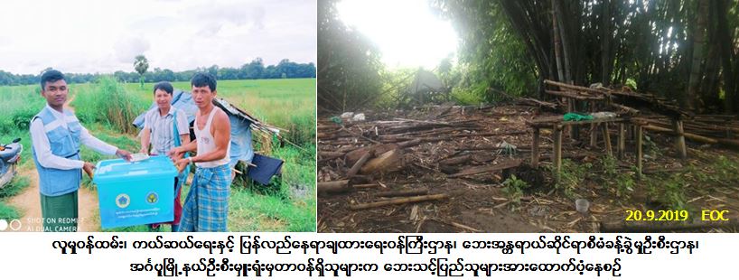 လူမှုဝန်ထမ်း၊ ကယ်ဆယ်ရေးနှင့် ပြန်လည်နေရာချထားရေးဝန်ကြီးဌာန၊ ဘေးအန္တရာယ်ဆိုင်ရာစီမံခန့်ခွဲမှုဦးစီး ဌာန၊ အင်္ဂပူမြို့နယ်ဦးစီးမှူးရုံးမှတာဝန်ရှိသူများသည် အင်္ဂပူမြို့နယ်၊အင်ပင်ကုန်းကျေးရွာအုပ်စု၊ အင်ပင်ကုန်းကျေးရွာ၌ (၁၉-၉-၂၀၁၉)ရက်နေ့တွင် ဖြစ်ပွားခဲ့သော လေပြင်းတိုက်ခတ်မှုကြောင့် လုံးဝပျက်စီးနေအိမ် (၁)လုံး၊ အိမ်ထာင်စု(၁)စုမှ လူဦးရေ(၁)ဦးဘေးသင့်ခဲ့ရာ အဆိုပါဘေးသင့်ပြည်သူအတွက် ကယ်ဆယ်ရေးပစ္စည်း(၁၆)မျိုး (၁)အိမ်ထောင်စုစာ၊ အိမ်ဆောက်ပစ္စည်း ဖိုးထောက်ပံ့ငွေ (၁၀၀,၀၀၀/-)ကျပ်၊ ဆန်ရိက္ခာဖိုးထောက်ပံ့ငွေ (၂,၁၀၀/-) ကျပ်တို့ကို (၂၀-၉-၂၀၁၉)ရက်နေ့တွင် ဘေးသင့်ပြည်သူများလက်ဝယ်အရောက် ထောက်ပံပေးအပ်ခဲ့ပါကြောင်း သတင်းရရှိပါသည်။