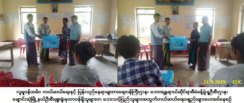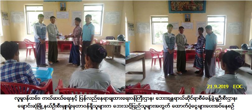လူမှုဝန်ထမ်း၊ ကယ်ဆယ်ရေးနှင့် ပြန်လည်နေရာချထားရေးဝန်ကြီးဌာန၊ ဘေးအန္တရာယ်ဆိုင်ရာစီမံခန့်ခွဲမှုဦးစီး ဌာန၊ ချောင်းဆုံမြို့နယ်ဦးစီးမှူးရုံးမှတာဝန်ရှိသူများသည် ချောင်းဆုံမြို့နယ်၊ ကရင်ဝင်းစိန်ကျေးရွာအုပ်စု၊ ဝဲကူးကျေးရွာ၌ (၁၉-၉-၂၀၁၉) ရက်နေ့တွင်ဖြစ်ပွားခဲ့သော လေပြင်းတိုက်ခတ်မှုကြောင့် ပြိုကျပျက်စီးနေအိမ်(၃)လုံးနှင့် တစ်စိတ်တစ်ပိုင်းပျက်စီးနေအိမ်(၃)တို့အတွက် အိမ်ဆောက်ပစ္စည်းဖိုးထောက်ပံ့ငွေ (၅၇၀,၀၀၀/-) ကျပ်၊ ဘေးသင့်လူဦးရေ(၂၆)ဦးအတွက် ဆန်ရိက္ခာ(၇) ရက်စာဖိုးထောက်ပံ့ငွေ (၅၄,၆၀၀/-) ကျပ်တို့ကို (၂၁-၉-၂၀၁၉)ရက်နေ့တွင် မြို့နယ်အထွေထွေအုပ်ချုပ်ရေးဦးစီးဌာနမှ တာဝန်ရှိသူများနှင့်အတူ လေဘေးသင့်ပြည်သူများလက်ဝယ်အရောက် ထောက်ပံ့ပေးအပ်ခဲ့ပါကြောင်း သတင်းရရှိပါသည်။