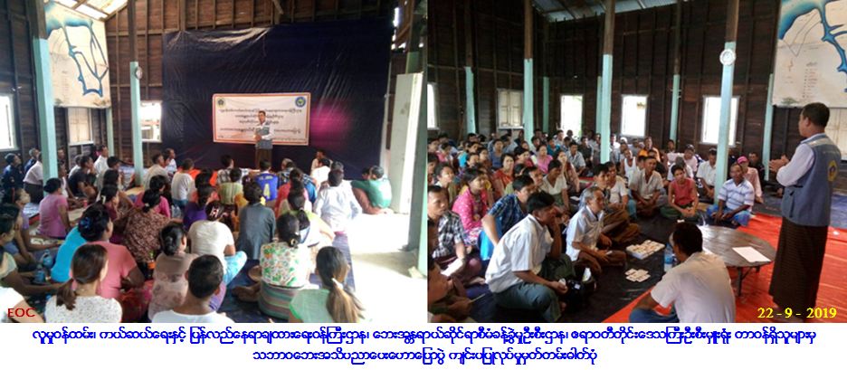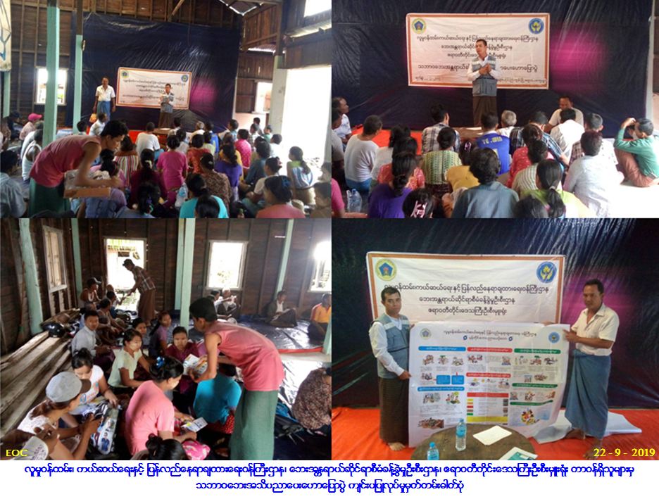 လူမှုဝန်ထမ်း၊ ကယ်ဆယ်ရေးနှင့် ပြန်လည်နေရာချထားရေးဝန်ကြီးဌာန၊ ဘေးအန္တရာယ်ဆိုင်ရာစီမံခန့်ခွဲမှုဦးစီးဌာန၊ ဧရာဝတီတိုင်းဒေသကြီးဦးစီးမှူးရုံးမှ တာဝန်ရှိသူများသည် (၂၂-၉-၂၀၁၉) ရက်နေ့ (၁၁း၀၀) နာရီအချိန်တွင် ငပုတော မြို့နယ်၊ ဟိုင်းကြီးကျွန်းမြို့၊ ချောင်းဝကျေးရွာအုပ်စု၊ ချောင်းဝကျေးရွာ၌ သဘာဝဘေးလျော့ပါးရေး အသိပညာပေး ဟောပြောပွဲဆောင်ရွက်ခဲ့ရာ ကျေးရွာနေပြည်သူ (၁၃၀) ဦးတက်ရောက်ခဲ့ပြီး တက်ရောက်လာသူများအား သဘာဝ ဘေးအသိပညာပေးဟောပြောခဲ့ပြီး လက်ကမ်းစာစောင်နှင့် ဗီနိုင်းပိုစတာပေးအပ်ခြင်းများကို ဆောင်ရွက်ခဲ့ပါကြောင်း သတင်းရရှိပါသည်။