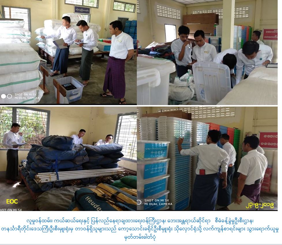 လူမှုဝန်ထမ်း၊ ကယ်ဆယ်ရေးနှင့် ပြန်လည်နေရာချထားရေးဝန်ကြီးဌာန၊ ဘေးအန္တရာယ်ဆိုင်ရာ စီမံခန့်ခွဲမှုဦးစီးဌာန၊ တနင်္သာရီတိုင်းဒေသကြီးဦးစီးမှူးရုံးမှ တာဝန်ရှိသူများသည် (၂၀.၉.၂၀၁၉)ရက်နေ့ ကော့သောင်းခရိုင်ဦးစီမှူးရုံး သိုလှောင်ရုံတွင် မြေပြင်လက်ကျန်စာရင်းကောက်ယူမှုတင်ပြခြင်း၊ သိုလှောင်ထားရှိသော ကယ်ဆယ်ရေးပစ္စည်းများ၊ အထောက်အကူပြုပစ္စည်းများနှင့် အလှူပစ္စည်းများ၏ မြေပြင်လက်ကျန်စာရင်းကို သွားရောက်ယူခဲ့ပါကြောင်း သတင်းရရှိပါသည်။