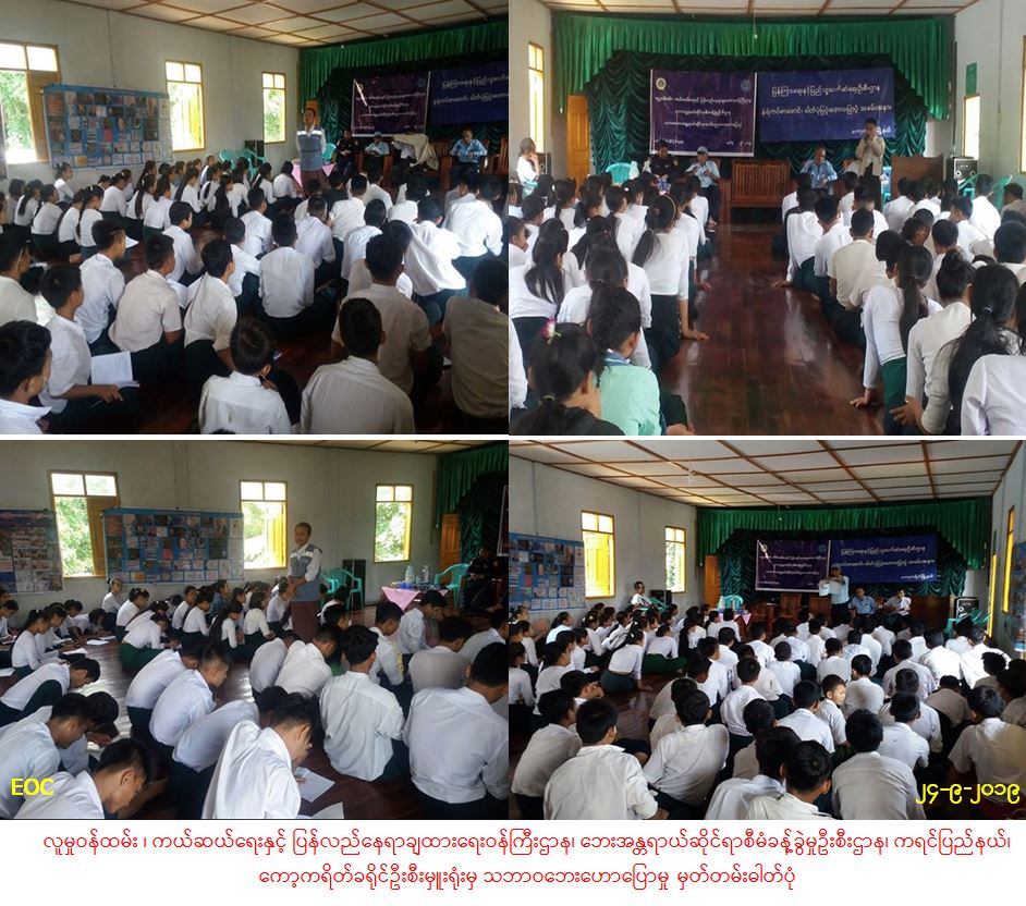 လူမှုဝန်ထမ်း ၊ ကယ်ဆယ်ရေးနှင့်ပြန်လည်နေရာချထားရေးဝန်ကြီးဌာန၊ ဘေးအန္တရာယ်ဆိုင်ရာစီမံခန့့်ခွဲမှုဦးစီးဌာန၊ ကရင်ပြည်နယ်၊ ကော့ကရိတ်ခရိုင်ဦးစီးမှူးရုံးမှ တာဝန်ရှိသူများသည် (၂၃.၉.၂၀၁၉)ရက်နေ့တွင် ခရိုင်ပြန်/ဆက်၊ မြို့နယ်မီးသတ်၊ မြို့နယ်စားသုံးသူရေးရာဦးစီးဌာနတို့နှင့်အတူ ကော့ကရိတ်မြို့နယ်၊ သမိန်ဒွတ်ကျေးရွာ အထက(ခွဲ)ကျောင်း၊ ကျောင်းသူ/ကျောင်းသား၊ ဆရာ/ဆရာမ(၁၅၀)ဦး တို့အား ကော့ကရိတ်ခရိုင်(ဘစမ)မှ ရေဘေး၊ လေဘေး၊ မြေပြိုဘေး၊ မိုးကြိုးဘေး၊ မုန်တိုင်းဘေးများအကြောင်း၊ ဘေးများမဖြစ်ပွားမီ/ ဖြစ်နေစဉ်/ ဖြစ်ပွားပြီး ရှောင်ရန်/ဆောင်ရန်များ ရှင်းလင်းပြောကြားခြင်း၊ ကယ်ဆယ်ရေးထောက်ပံ့ပစ္စည်းများနှင့် ပတ်သတ်၍ ထောက်ပံ့နေမှုများအား ဟောပြောခြင်းများဖြင့်လည်ကောင်း၊ ခရိုင်ပြန်/ဆက်မှ စာဖတ်ခြင်း၏ အကျိုးကျေးဇူး များခြင်း၊ ကျောင်းသူ/သားများ အကျင့်စာရိတ္တကောင်းကျိုး၊ ဆိုးပြစ်များအကြောင်း ဗဟုသုတများဖြင့် ရှင်းလင်းပြော ကြားခြင်း၊ ရည်ရွယ်ချက်ရည်မှန်းချက်များထားပြီး ကျောင်း၏အောင်ချက်ရာခိုင်းနှုန်းများ ကောင်းအောင်ကြိုးစား ကြရန် အားပေးပြောကြားခြင်းများဖြင့်လည်ကောင်း၊ မြို့နယ်မီးသတ်မှမီးဘေးအန္တရာယ်နှင့် ငလျင်ဘေးများ အကြောင်း ရှောင်ရန်/ဆောင်ရန် အသုံးပြုပုံများအား သရုပ်ပြခြင်းများဖြင့်လည်ကောင်း၊ မြို့နယ်စားသုံးသူရေးရာမှ အစားအသောက်နှင့်ပတ်သတ်၍ စားသုံးရန်သင့်/မသင့် ရှောင်ရန်၊ဆောင်ရန်များ အသိဗဟုသုတ ရစေရန် ပြောကြားခြင်းများဖြင့်လည်ကောင်း အသိပညာပေးလုပ်ငန်းများ ဆောင်ရွက်ခဲ့ပါေကြာင်း သတင်းရရှိပါသည်။