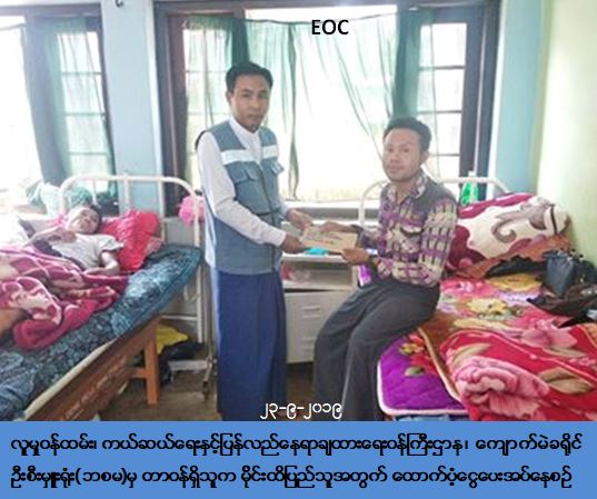 လူမှုဝန်ထမ်း၊ ကယ်ဆယ်ရေးနှင့်ပြန်လည်နေရာ ချထားရေး ဝန်ကြီးဌာန၊ ဘေးအန္တရာယ်ဆိုင်ရာ စီမံခန့်ခွဲမှုဦးစီး ဌာန၊ ကျောက်မဲခရိုင်ဦးစီးမှူးရုံးမှ တာဝန်ရှိသူများသည် (၂၂-၉-၂၀၁၉) ရက်နေ့၌ ကျောက်မဲမြို့နယ်၊ မိုင်းငေါ့မြို့၊ ချုံးကျေးရွာအုပ်စု၊ ချုံးကျေးရွာတွင် မိုင်းထိမှန်၍ ဒဏ်ရာရရှိသူ(၁)ဦးအတွက် ထောက်ပံ့ငွေကျပ် (၅၀,၀၀၀) အား (၂၃-၉-၂၀၁၉) ရက်နေ့ (၁၄:၀၀) နာရီအချိန်တွင် ကျောက်မဲမြို့ပြည်သူ့ဆေးရုံကြီးတွင် ပြည်သူများ လက်ဝယ် အရောက် ထောက်ပံပေးအပ်ခဲ့ကြောင်း သိရှိရပါသည်။