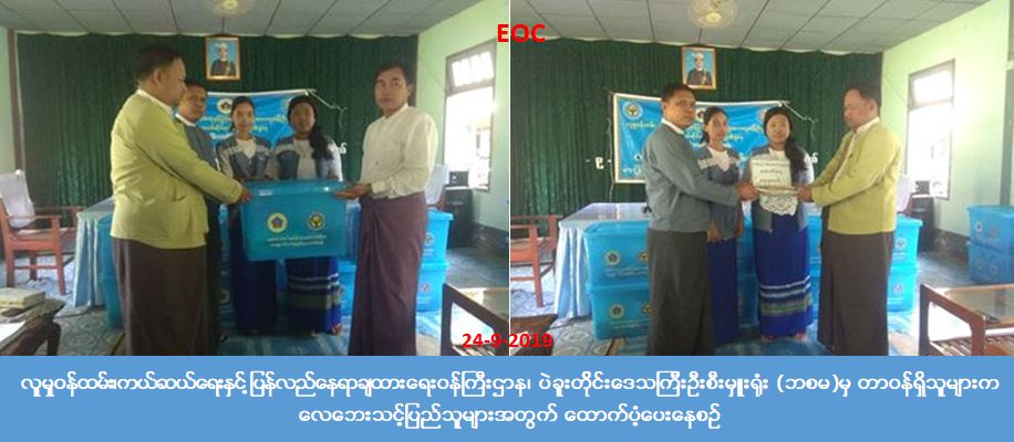 (၂၁-၉-၂၀၁၉)ရက်နေ့၊ ပဲခူးတိုင်းဒေသကြီး၊ ကျောက်တံခါးမြို့နယ်၊ ကျေးရွာအုပ်စု(၉)အုပ်စုတို့တွင် ဖြစ်ပွားခဲ့သော လေဘေးမှ ပြိုလဲဘုန်းကြီးကျောင်း(၃)ကျောင်း၊ ပြိုလဲနေအိမ်(၁၅)လုံး၊ အမိုးလန်ဘုန်းကြီးကျောင်း(၃)ကျောင်းတို့အတွက် အိမ်/ကျောင်းဆောက်ပစ္စည်းဖိုးထောက်ပံ့ငွေ(၂,၄၀၀,၀၀၀)ကျပ်၊ ပြိုလဲနေအိမ်(၁၅)လုံးနှင့် အမိုးလန်နေအိမ်(၃၁)လုံးတို့ရှိ လူဦးရေ(၂၁၈)ဦးတို့အတွက် ဆန်ရိက္ခာဖိုးထောက်ပံ့ငွေ (၄၅၇,၈၀၀)ကျပ်၊ စုစုပေါင်းထောက်ပံ့ငွေ(၂,၈၅၇,၈၀၀)ကျပ်နှင့် ကယ်ဆယ်ရေးပစ္စည်း(၁၅)မျိုး(ပလပ်စတစ်ပုံးအပါ)(၁၅)အိမ်ထောင်စာတန်ဖိုးငွေ(၄၈၅,၂၉၅)ကျပ်တို့အား ပဲခူးတိုင်းဒေသကြီးဦးစီးမှူးရုံးဝန်ထမ်းများမှ (၂၄-၉-၂၀၁၉)ရက်နေ့တွင် သွားရောက်ထောက်ပံ့ပေးခဲ့ကြောင်း သိရှိရပါသည်။