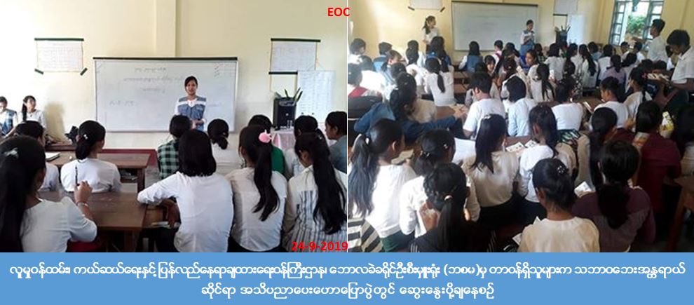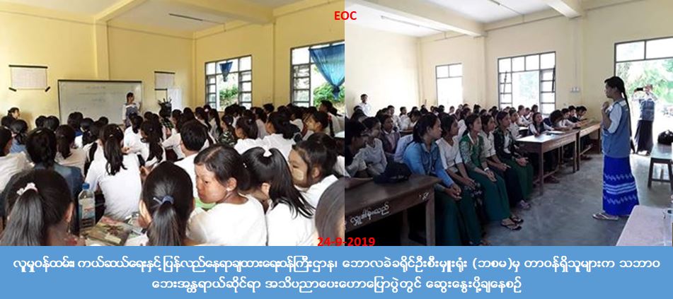 လူမှုဝန်ထမ်း၊ ကယ်ဆယ်ရေးနှင့်ပြန်လည်နေရာချထားရေးဝန်ကြီးဌာန၊ ဘေးအန္တရာယ်ဆိုင်ရာ စီမံခန့်ခွဲမှုဦးစီးဌာန၊ ဘောလခဲခရိုင်ဦးစီးမှူးရုံးမှ တာဝန်ရှိသူများသည် (၂၄-၉-၂၀၁၉)ရက်နေ့၊ (၁၄:၀၀) နာရီအချိန်တွင် ဘောလခဲခရိုင်၊ ဖားဆောင်းမြို့နယ်၊အ.ထ.က (ဖားဆောင်း)၌ ကျောင်းသား/ကျောင်းသူ (၁၀၀)ဦးအား သဘာဝဘေးအန္တရာယ်ဆိုင်ရာ အသိပညာပေးဟောပြောပွဲ ကျင်းပခဲ့ပြီး တက်ရောက်လာသူများကို အသိပညာပေးလက်ကမ်းစာစောင်များ ဝေငှခဲ့ကြောင်း သိရှိရပါသည်။