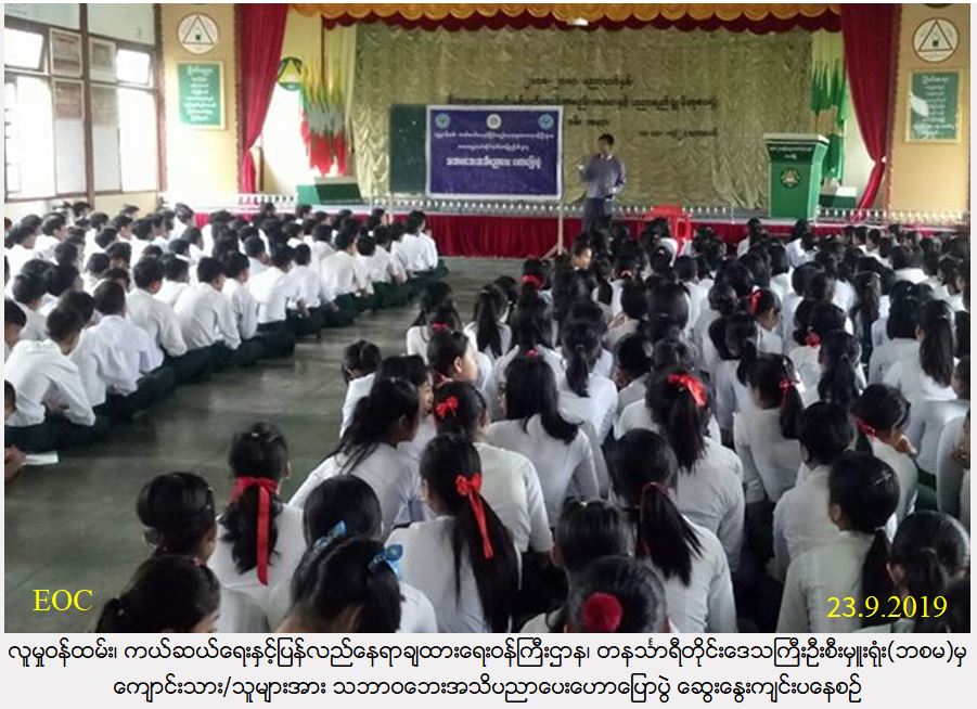 လူမှုဝန်ထမ်း၊ ကယ်ဆယ်ရေးနှင့်ပြန်လည်နေရာချထားရေးဝန်ကြီးဌာန၊ ဘေးအန္တရာယ်ဆိုင်ရာစီမံခန့်ခွဲမှုဦးစီးဌာန၊ တနင်္သာရီတိုင်းဒေသကြီးဦးစီးမှူးရုံးမှ (၂၃-၉-၁၉) ရက်နေ့ အ.ထ.က(၂) (ထားဝယ်) တွင် သဘာဝဘေးအန္တရာယ်ဆိုင်ရာ အသိပညာပေးဟောပြောပွဲဆောင်ရွက်ခဲ့ရာ ကျောင်းသား/သူအင်အား (၂၀၀)ခန့်တက်ရောက်ခဲ့ကြောင်း သတင်းရရှိပါသည်။