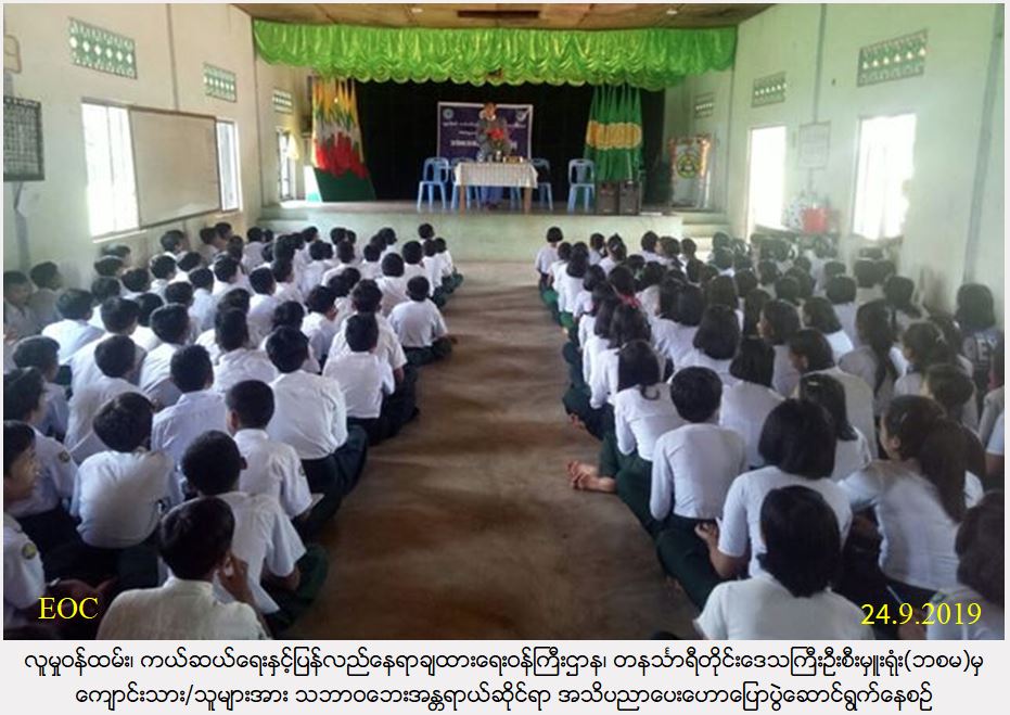 လူမှုဝန်ထမ်း၊ ကယ်ဆယ်ရေးနှင့်ပြန်လည်နေရာချထားရေးဝန်ကြီးဌာန၊ ဘေးအန္တရာယ်ဆိုင်ရာစီမံခန့်ခွဲမှုဦးစီးဌာန၊ တနင်္သာရီတိုင်းဒေသကြီးဦးစီးမှူးရုံး(ဘစမ)မှ (၂၄.၉.၁၉)ရက်နေ့ ထားဝယ်မြို့နယ် အ.လ.ကခွဲ (မောင်မယ်ရှောင်)ကျောင်းတွင် သဘာဝဘေးအန္တရာယ်ဆိုင်ရာ အသိပညာပေးဟောပြောပွဲဆောင်ရွက်ခဲ့ရာ ကျောင်းသား/သူအင်အား(၂၀၀)ခန့်တက်ရောက်ခဲ့ကြောင်း သတင်းရရှိပါသည်။