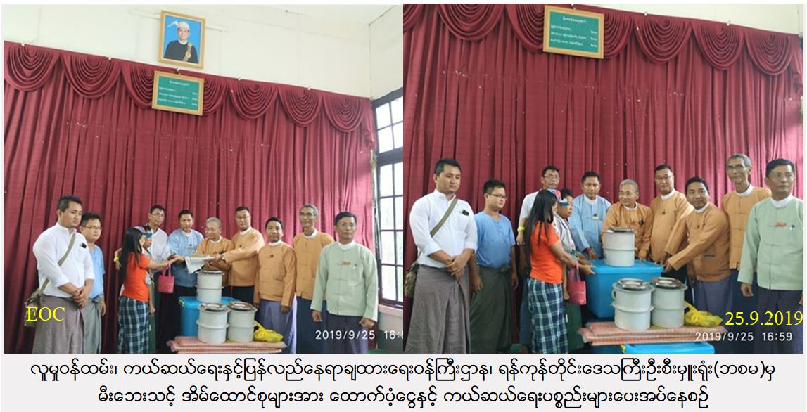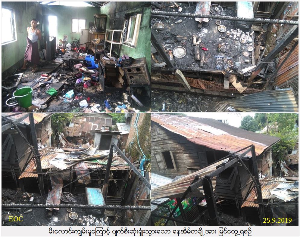 လူမှုဝန်ထမ်း၊ ကယ်ဆယ်ရေးနှင့်ပြန်လည်နေရာချထားရေးဝန်ကြီးဌာန၊ ဘေးအန္တရာယ်ဆိုင်ရာစီမံခန့်ခွဲမှုဦးစီးဌာန၊ ရန်ကုန်တိုင်းဒေသကြီးဦးစီးမှူးရုံးမှ ရန်ကုန်တိုင်းဒေသကြီး၊ မြောက်ပိုင်းခရိုင်၊ အင်းစိန်မြို့နယ်၊ ရွာမအနောက်ရပ်ကွက်၊ မြို့ပတ်လမ်း၊ အိမ်အမှတ်(၅၁၇)နေ ဒေါ်ရီရီဝင်း၏ နေအိမ်၌ ဘုရားဆီမီးပူဇော်စဉ် ဖယောင်းတိုင်လဲကျသွားရာမှတဆင့် (၂၃-၉-၂၀၁၉)ရက်နေ့(၁၁:၃၅)အချိန်တွင် မီးလောင်မှုဖြစ်ပွားခဲ့ရာ နေအိမ်(၂)လုံး မီးလောင်ဆုံးရှုံးခဲ့ပြီး အိမ်ထောင်စု(၃)စုမှ လူဦးရေ(၉)ဦး မီးဘေးသင့်ခဲ့သဖြင့် ထိုမီးဘေးသင့် အိမ်ထောင်စုများအား ကယ်ဆယ်ရေးပစ္စည်း(၁၆)မျိုး (၃)အိမ်ထောင်စုစာ၊ ကလေးကျောင်းဝတ်စုံ(ကျား+မ) (၂)စုံ၊ အိမ်ဆောက်ပစ္စည်းဖိုးထောက်ပံ့ငွေကျပ်(၄,၀၀,၀၀ဝိ/-)၊ လူဦးရေ(၉)ဦးအတွက် ဆန်ရိက္ခာဖိုးထောက်ပံ့ငွေကျပ်(၁၈၉၀ဝိ/-)၊ စုစုပေါင်းထောက်ပံ့ငွေကျပ်(၄၁၈,၉၀ဝိ/-)အား ပြည်သူ့လွှတ်တော်ကိုယ်စားလှယ်၊ တိုင်းဒေသကြီးလွှတ်တော်ကိုယ်စားလှယ်များ၊ အထွေထွေအုပ်ချုပ်ရေးဦးစီးဌာနမှတာဝန်ရှိသူများနှင့်အတူ ဘေးသင့်ပြည်သူများထံသို့ (၂၅-၉-၂၀၁၉)ရက်နေ့တွင် သွားရောက်၍ထောက်ပံ့ပေးခဲ့ကြောင်း သတင်းရရှိပါသည်။