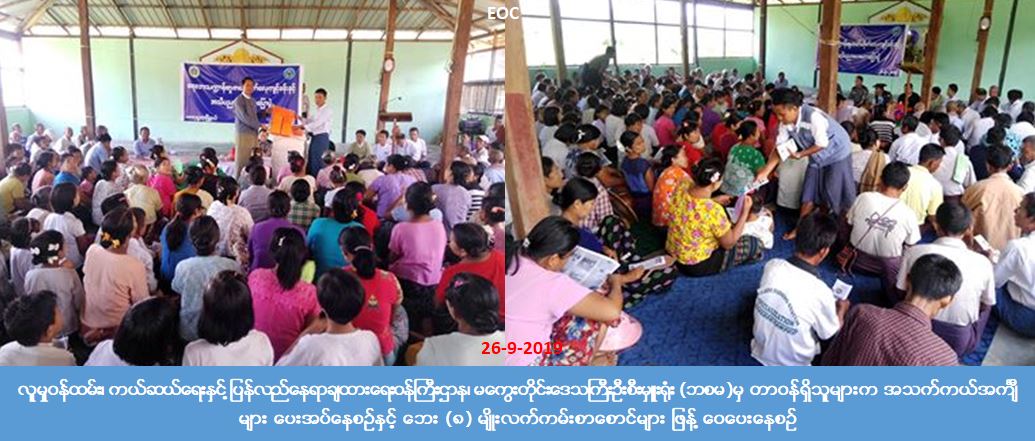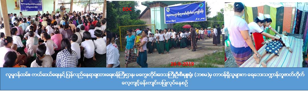 လူမှုဝန်ထမ်း၊ ကယ်ဆယ်ရေးနှင့် ပြန်လည်နေရာချထားရေးဝန်ကြီးဌာန၊ ဘေးအန္တရာယ်ဆိုင်ရာစီမံခန့့်ခွဲမှုဦးစီး ဌာန၊ မကွေးတိုင်းဒေသကြီးဦးစီးမှူးရုံးမှ တာဝန်ရှိသူများသည် မကွေးတိုင်းဒေသကြီး၊ မင်းဘူးခရိုင်၊ စေတုတ္တရာ မြို့နယ်၊ အုတ်ပုံကျေးရွာအုပ်စု၊ အုပ်ပုံကျေးရွာတွင် ရေဘေးသဏ္ဍာန်တူဇာတ်တိုက်လေ့ကျင့်ခန်းကို မြို့နယ်သဘာဝဘေးအန္တရာယ်ဆိုင်ရာစီမံခန့်ခွဲမှုအဖွဲ့များနှင့်တကွ (၂၆-၉-၂၀၁၉)ရက်နေ့၊ (၀၉:၀၀) အချိန်ခန့်က ပြုလုပ်ခဲ့ရာ ကျေးရွာပြည်သူ လူထုအင်အား (၃၀၀) ဦးခန့် ပူးပေါင်းပါဝင်ဆောင်ရွက်ခဲ့ကြပါသည်။ ထို့နောက် ရှင်းလင်းဆောင်ခန်းမ၌ မြို့နယ်ဆည်မြောင်းနှင့် ရေအသုံးချမှုစီမံခန့်ခွဲရေးဦးစီးဌာနမှ တာဝန်ရှိသူက မုန်းချောင်းရေလှောင်တမံတွင် အရေးပေါ်အခြေအနေ ကြိုတင်စီမံခန့်ခွဲမှု အဆင့်(၁)တွင် စိုးရိမ်ဖွယ်ရာမရှိ၍ မြင်သာသောနေရာများတွင် အစိမ်းရောင်အလံကိုလွင့်ထူထားပေးခြင်း ရေကြီးမှုဖြစ်ပေါ်လာနိုင်ပါက အရေးပေါ်အခြေအနေ ကြိုတင်စီမံခန့်ခွဲမှု အဆင့်(၂)အဖြစ် သတ်မှတ်ပြီး အဝါရောင်အလံကို လွင့်ထူ၍ အသံချဲ့စက်ဖြင့် လှည့်လည်ကြေငြာခြင်း တမံကျိုးပေါက်နိုင်သည့်အခြေအနေကို အရေးပေါ်အခြေအနေစီမံခန့်ခွဲမှု အဆင့်(၃)ဟု သတ်မှတ်ပြီး အနီရောင်အလံလွင့်ထူခြင်းတို့ဖြင့် စီမံထားရှိမှုအခြေအနေကို ရှင်းလင်းပြောကြားခဲ့ပြီး တက်ရောက်လာသူများက သိရှိလိုသည်များအား မေးမြန်းခဲ့ကြပြီး တာဝန်ရှိသူများက ပြန်လည်ဖြေကြားခဲ့ပါကြောင်း၊ အရေးပေါ်အခြေအနေတွင် အသုံးပြုရန်အတွက် အသက်ကယ်အင်္ကျီ (၅၀)ထည်အား ကျေးရွာအုပ်စုသဘာဝဘေးအန္တရာယ်ဆိုင်ရာစီမံခန့်ခွဲမှုအဖွဲ့သို့ ပေးအပ်ခဲ့ပါကြောင်းနှင့် ဘေး(၈)မျိုးလက်ကမ်းစာစောင်များ ဖြန့်ဝေပေးခဲ့ပါကြောင်း သိရှိရပါသည်။