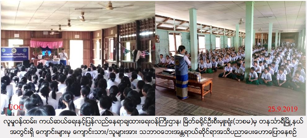 လူမှုဝန်ထမ်း၊ ကယ်ဆယ်ရေးနှင့်ပြန်လည်နေရာချထားရေးဝန်ကြီးဌာန၊ ဘေးအန္တရာယ်ဆိုင်ရာစီမံခန့်ခွဲမှုဦးစီးဌာန၊ မြိတ်ခရိုင်ဦးစီးမှူးရုံးမှ (၂၄.၉.၂၀၁၉)နေ့ တနင်္သာရီမြို့နယ် အ.ထ.က(ပဝ)၌ ကျောင်းသားကျောင်းသူအင်အား (၃၀၀)ဦး၊ (၂၅.၉.၂၀၁၉)နေ့ နံနက် (၉း၃၀) တွင် အ.ထ.ကခွဲ(ဇဝဲ)၌ ကျောင်းသားကျောင်းသူ အင်အား (၃၀၀)ဦး၊ နေ့လည် (၁း၃၀)အချိန်တွင် အ.ထ.က(တနင်္သာရီ) ၌ ကျောင်းသားကျောင်းသူအင်အား (၄၀၀)ဦးတို့အား သဘာဝဘေးအသိပညာပေးဟောပြောခြင်း၊ ဗီဒီယိုဖိုင်ပြသခြင်း ဘောပင်နှင့်လက်ကမ်းစာစောင်များဝေငှခြင်းတို့ကို မြိတ်ဘေးစီမံမှ သွားရောက်ဆောင်ရွက်ခဲ့ကြောင်း သတင်းရရှိပါသည်။