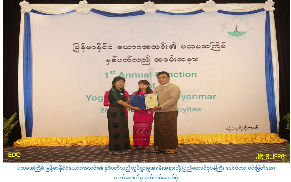 ပြည်ထောင်စုဝန်ကြီးက ပြောကြားရာတွင် ယောဂလေ့ကျင့်ခြင်းဟာ အပြည်ပြည်ဆိုင်ရာ အသိအမှတ်ပြု အားကစားတစ်ခုလည်းဖြစ်ပါကြောင်း၊ မြန်မာနိုင်ငံမှာလည်း အာရှနှင့် အပြည်ပြည် ဆိုင်ရာ ယောဂအားကစားပြိုင်ပွဲကို ယခုနှစ် ဖေဖော်ဝါရီလ၌ ကျင်းပခဲ့ကြောင်း၊ ယောဂလေ့ကျင့်ခြင်းသည် လူသားတို့၏ ကျန်းမာရေးအပေါ် အထူးကောင်းမွန်သော အကျိုးသက်ရောက်မှုရှိကြောင်းကို နိုင်ငံတကာတွင် သိပ္ပံသုတေသနများ ပြုလုပ်လေ့လာပြီး သက်သေပြထားပြီး ဖြစ်ကြောင်း၊ အသင်း၏ အဓိကရည်ရွယ်ချက်များ အနေဖြင့်လည်း Brotherhood- ညီရင်းအစ်ကို မောင်ရင်းနှစ်မသဖွယ် ရင်နှီးချစ်ကြည်ခြင်း၊ Harmony – ညီညွှတ်မျှတ သဟဇာတဖြစ်ခြင်း၊ Peace – ငြိမ်းချမ်းသာယာခြင်း၊ Creat a positive and effective environment – အပြုသဘောဆောင်သော ထိရောက်သော လူသားအကျိုးပြု လူမှုပတ်ဝန်းကျင် ဖန်တီးခြင်း စသည်တို့ ဖြစ်ထွန်းစေရန် ဖြစ်ကြောင်း လေ့လာသိရှိရကြောင်း၊ ဒါ့အပြင် ယောဂလေ့ကျင့်ခြင်းဟာ စိတ်တည်ငြိမ်အေးချမ်းခြင်းနှင့် ကိုယ်ခန္ဓာ ကျန်းမာလန်းဆန်း၍ သွက်လက်ပေါ့ပါးစေသော ကိုယ်စိတ်နှစ်ပါး အကျိုးဖြစ်ထွန်းစေမည့် ကျင့်စဉ်များဖြစ်၍ ကမ္ဘာ့ကုလသမဂ္ဂအဖွဲ့ကြီးက ထုတ်ပြန်ထားသော ကျန်းမာခြင်း၏ အဓိပ္ပါယ် ဖွင့်ဆိုချက်နှင့် ကိုက်ညီပါကြောင်း၊ နိုင်ငံတော်အစိုးရအနေနဲ့ နိုင်ငံတော်တည်ငြိမ်အေးချမ်းရေးနှင့် လူမှုစီးပွား ဖွံ့ဖြိုးတိုးတက် ရေးအတွက် ဦးတည်ဆောင်ရွက်လျက်ရှိရာမှာ အနာဂတ်နိုင်ငံတော်အတွက်ပါ မျှော်မှန်းပြီး စွမ်းရည်ပြည့်ဝသော လူသားအရင်းအမြစ်များထွက်ပေါ်လာရေး ကြိုးစားဆောင်ရွက် လျက် ရှိပါကြောင်း၊ လူမှုဝန်ထမ်း၊ ကယ်ဆယ်ရေးနှင့် ပြန်လည်နေရာချထားရေးဝန်ကြီးဌာန အနေဖြင့် စွမ်းရည်ပြည့်ဝသော လူသားအရင်းအမြစ်များထွက်ပေါ်လာရေးအတွက် ရှေးဦးအရွယ် ကလေးသူငယ်မှစ၍ သက်ကြီးရွယ်အိုအထိ လူမှုကာကွယ်စောင့်ရှောက်ရေးလုပ်ငန်းများကို အကောင်အထည်ဖော်လျက်ရှိရာ ကလေးသူငယ်များ၏ အခွင့်အရေးများကိုဖော်ဆောင်ခြင်း၊ လူငယ်များအတွက် မူဝါဒများချမှတ်ပြီး မဟာဗျူဟာများရေးဆွဲဆောင်ရွက်ခြင်း၊ မသန်စွမ်းများအတွက် အခွင့်အရေးများ ဖော်ဆောင်ခြင်းနှင့် စွမ်းနိုင်သမျှစွမ်းအောင် ပံ့ပိုးမှုဖြင့် ဘဝရပ်တည် ဖွံ့ဖြိုးမှုရရှိစေခြင်းနှင့် သက်ကြီးရွယ်အိုများအတွက် အသက်အရွယ်ခွဲခြားမှုမရှိဘဲ စွမ်းအားများ မြှင့်တင်ပေးပြီး ရွှင်လန်းတက်ကြွသော လူမှုအကျိုးပြု သက်ကြီးရွယ်အိုများဘဝကို ဖြတ်သန်းစေခြင်း စသည်ကို မျှော်မှန်းဆောင်ရွက်လျက်ရှိရာ ယောဂကျင့်စဉ်များသည် အသက်အရွယ်မရွေး လေ့ကျင့်ဆောင်ရွက်နိုင်သဖြင့် မိမိတို့ဝန်ကြီးဌာန၏ မျှော်မှန်း ဆောင်ရွက်ချက်များကို တစ်စိတ်တစ်ဒေသ ဖြည့်ဆည်းပေးနိုင်မည်ဖြစ်ကြောင်း၊ ဒါ့အပြင် မိမိ