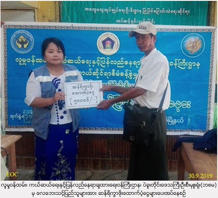 လူမှုဝန်ထမ်း၊ ကယ်ဆယ်ရေးနှင့်ပြန်လည်နေရာချထားရေးဝန်ကြီးဌာန၊ ဘေးအန္တရာယ်ဆိုင်ရာစီမံခန့်မှုဦးစီးဌာန၊ ပဲခူးတိုင်းဒေသကြီးဦးစီးမှူးရုံးမှတာဝန်ရှိသူများသည် (၂-၉-၂၀၁၉) ရက်နေ့၌ ပဲခူးတိုင်းဒေသကြီး၊ သာယာဝတီခရိုင်၊ အုတ်ဖိုမြို့နယ်၊ ကွေ့ချောင်းရပ်ကွက်နှင့်ဘလားကျေးရွာအုပ်စု၊ ရွာသစ်ကျေးရွာတို့တွင်ဖြစ်ပွားခဲ့သော လေဘေးမှ လေဘေးသင့်အမိုးလန်နေအိမ် (၇)လုံးတို့ရှိ လူဦးရေ(၂၈)ဦးတို့အတွက် ဆန်ရိက္ခာ(၇)စာဖိုး ထောက်ပံ့ငွေ(၅၈၈၀ဝိ)၊ စုစုပေါင်း ထောက်ပံ့ငွေ(၅၈၈၀ဝိ/)အား (၃၀-၉-၂၀၁၉) ရက်နေ့နံနက်(၁၂:၀၀)အချိန်တွင် ပဲခူးတိုင်းဒေသ ကြီးသာယာဝတီခရိုင်၊ အုတ်ဖိုမြို့နယ်အထွေထွေအုပ်ချုပ်ရေးဦးစီးဌာနရုံး၌ အုတ်ဖိုမြို့နယ် အထွေထွေအုပ်ချုပ်ရေးဦးစီးဌာနမှတာဝန်ရှိသူများ၊ သက်ဆိုင်ရာရပ်ကွက်/ကျေးရွာအုပ်ချုပ်ရေးမှူးများနှင့်အတူ ဘေးသင့်ပြည်သူများလက်ဝယ်အရောက် သွားရောက်ထောက်ပံ့ပေးအပ်ခဲ့ကြောင်း သတင်းရရှိပါသည်။