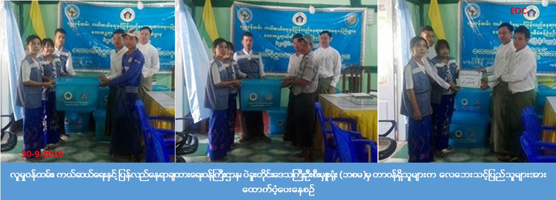 လူမှုဝန်ထမ်း၊ ကယ်ဆယ်ရေးနှင့် ပြန်လည်နေရာချထားရေး ဝန်ကြီးဌာန၊ ဘေးအန္တရာယ် ဆိုင်ရာစီမံခန့်မှု ဦးစီး ဌာန၊ ပဲခူးတိုင်းဒေသကြီးဦးစီးမှူးရုံးမှတာဝန်ရှိသူများသည် (၂၇-၉-၂၀၁၉) ရက်နေ့၌ပဲခူးတိုင်းဒေသကြီး၊ သာယာဝတီခရိုင်၊ လက်ပံတန်းမြို့နယ်၊ ဗောဓိပင်ကျေးရွာအုပ်စု၊ ဗောဓိပင်ကျေးရွာ၊ ဖန်ခါးကုန်းကျေးရွာနှင့် ကျာင်းစုကျေးရွာတို့တွင် ဖြစ်ပွားခဲ့သောလေဘေးမှလေဘေးသင့် ပြိုလဲနေအိမ်(၉)လုံး၊ အမိုးလန်ဘုန်းတောြ်ကီး ကျောင်း(၁) ကျောင်းတို့်အ တွက်ကျောင်း/အိမ်ဆောက်ပစ္စည်း ဖိုးထောက်ပံ့ငွေ (၁,၀၀၀,၀၀၀)ကျပ်၊ ပြိုလဲနေအိမ် (၉) လုံးနှင့် အမိုးလန်နေအိမ်(၅၄)လုံးတို့ရှိ လူဦးရေ(၂၉၆)ဦးတို့အတွက် ဆန်ရိက္ခာ(၇)စာဖိုး ထောက်ပံ့ငွေ (၆၂၁,၆၀၀)ကျပ်၊ စုစုပေါင်းထောက်ပံ့ငွေ(၁,၆၂၁,၆၀၀) ကျပ်နှင့်ပြိုလဲနေအိမ်(၉)လုံး အတွက် ကယ်ဆယ်ရေး ပစ္စည်း (၁၅) မျိုးပါ (၉)အိမ်ထောင်စာတို့အား (၃၀-၉-၂၀၁၉) ရက်နေ့နံနက်(၁၀:၃၀)အချိန်တွင် ပဲခူးတိုင်း ဒေသကြီး၊ သာယာဝတီခရိုင်၊ လက်ပံတန်းမြို့နယ် အထွေထွေအုပ်ချုပ်ရေး ဦးစီးဌာနရုံး၌ လက်ပံတန်းမြို့နယ် အထွေထွေအုပ်ချုပ်ရေးဦးစီးဌာနမှ တာဝန်ရှိသူများသက်ဆိုင်ရာရပ်ကွက်/ကျေးရွာအုပ်ချုပ်ရေးမှူးများနှင့်အတူ ဘေးသင့်ပြည်သူများ လက်ဝယ်အရောက်သွားရောက် ထောက်ပံ့ပေးအပ်ခဲ့ကြောင်း သိရှိရပါသည်။