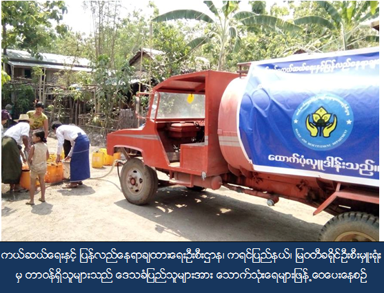 ကယ်ဆယ်ရေးနှင့် ပြန်လည်နေရာချထားရေး ဦးစီး ဌာန၊ ကရင်ပြည်နယ်၊ မြဝတီခရိုင်ဦးစီးမှူးရုံးမှ တာဝန်ရှိသူများသည် (၁၅-၅-၂၀၁၆) ရက်နေ့တွင် မြဝတီမြို့နယ်၊ အမှတ်(၃) ရပ်ကွက်၊ သစ္စာ(၂)လမ်းရှိ ပြည်သူများအား သောက်သုံးရေဂါလံ (၁၀၀၀) လျူဒါန်းခဲ့ပါသည်၊၊