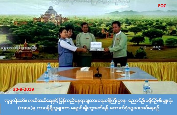 လူမှုဝန်ထမ်း၊ ကယ်ဆယ်ရေးနှင့် ပြန်လည်နေရာချထားရေး ဝန်ကြီးဌာန၊ ဘေးအန္တရာယ်ဆိုင်ရာ စီမံခန့်ခွဲ မှုဉီးစီးဌာန၊ ညောင်ဉီးခရိုင်ဉီးစီးမှူးရုံးမှ တာဝန်ရှိသူများသည် ညောင်ဉီးမြို့နယ်၊ ကန်နီပေါက်ကျေးရွာ အုပ်စု၊ ကန်နီပေါက်ကျေးရွာရှိ ချောင်းရိုးအား စက်ယန္တရားများဖြင့် တူးဖော်ဆောင်ရွက်မည့် ကုန်ကျငွေ (၇,၇၆၈,၀၀၀) ကျပ်ကို (၃၀-၉-၂၀၁၉)ရက်နေ့တွင် ညောင်ဉီးခရိုင်အထွေထွေအုပ်ချုပ်ရေးဉီးစီးဌာနရုံး၊ အစည်းအဝေးခန်းမ၌ ခရိုင်အုပ်ချုပ်ရေးမှူး၊ ကန်နီပေါက်ကျေးရွာအုပ်ချုပ်ရေးမှူးနှင့် သက်ဆိုင်ရာ တာဝန်ရှိသူများ၏ ရှေ့မှောက်တွင် မြို့နယ်အုပ်ချုပ်ရေးမှူး၏ လက်ဝယ်အရောက် ထောက်ပံ့ပေးအပ်ခဲ့ ကြောင်း သိရှိရပါသည်။