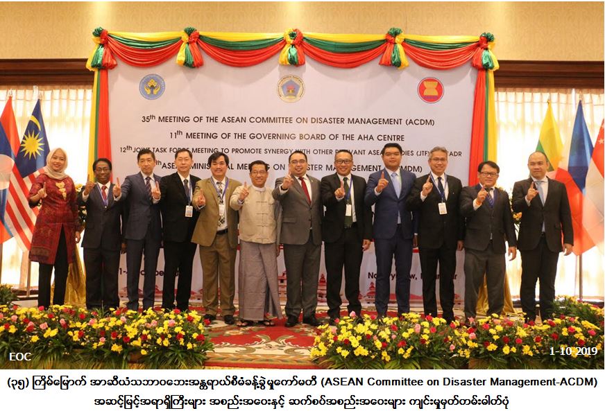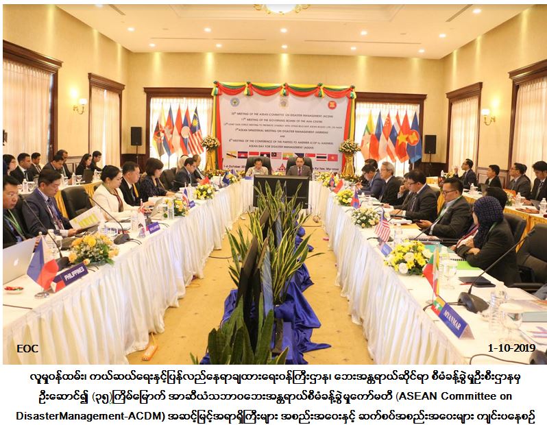 လူမှုဝန်ထမ်း၊ ကယ်ဆယ်ရေးနှင့်ပြန်လည်နေရာချထားရေးဝန်ကြီးဌာန၊ ဘေးအန္တရာယ်ဆိုင်ရာ စီမံခန့်ခွဲမှုဦးစီးဌာနသည် (၃၅) ကြိမ်မြောက် အာဆီယံသဘာဝဘေးအန္တရာယ်စီမံခန့်ခွဲမှု ကော်မတီ အစည်းအဝေးနှင့် ဆက်စပ်အစည်းအဝေးများကို (၁-၁၀-၂၀၁၉) နေ့မှ (၄-၁၀-၂၀၁၉)နေ့အထိ ရွှေစံအိမ် ဟိုတယ်၊ နေပြည်တော်၌ အိမ်ရှင်အဖြစ်လက်ခံကျင်းပပြုလုပ်လျက်ရှိပါသည်။ အဆိုပါအစည်းအဝေး၏ ပထမနေ့အဖြစ် (၃၅) ကြိမ်မြောက် အာဆီယံသဘာဝဘေးအန္တရာယ် စီမံခန့်ခွဲမှုကော်မတီ အစည်းအဝေးကို ယနေ့ နံနက် (၉:၀၀)နာရီအချိန်တွင် ရွှေစံအိမ်ဟိုတယ်၌ကျင်းပပြုလုပ်ရာ အာဆီယံသဘာဝဘေးအန္တရာယ် စီမံခန့်ခွဲမှုကော်မတီ (ACDM) ၏အလှည့်ကျ ဥက္ကဋ္ဌဖြစ်သူဘေးအန္တရာယ်ဆိုင်ရာစီမံခန့်ခွဲမှုဦးစီးဌာန၊ ညွှန်ကြားရေးမှူးချုပ်၊ ဒေါက်တာကိုကိုနိုင် နှင့် ပူးတွဲဥက္ကဋ္ဌဖြစ်သူ Mr. Kistoffer James E. Purisima, Assistant Secretary/ Deputy Administrator for Administration, Philippines တို့က ဦးဆောင်၍ ကျင်းပပြုလုပ်ခဲ့ကြပါသည်။