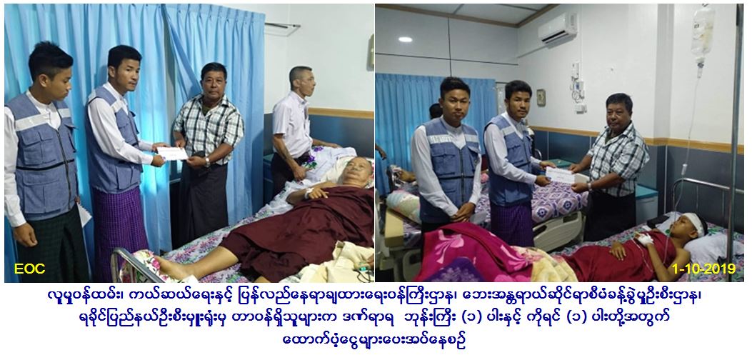 လူမှုဝန်ထမ်း၊ ကယ်ဆယ်ရေးနှင့် ပြန်လည်နေရာချထားရေးဝန်ကြီးဌာန၊ ဘေးအန္တရာယ် ဆိုင်ရာစီမံခန့်ခွဲမှုဦးစီးဌာန၊ ရခိုင်ပြည်နယ်ဦးစီးမှူးရုံးမှ တာဝန်ရှိသူများသည် ကျောက်တော်မြို့နယ်အတွင်း တိုက်ပွဲများဖြစ်ပွားမှုကြောင့် ကျောက်တော်မြို့နယ်၊ မီးဝကျေးရွာမှ လက်နက်ကြီး ကျည်စထိမှန်၍ စစ်တွေပြည်သူ့ဆေးရုံသို့ ဆေးကုသခံယူရန် ရောက်ရှိလာသည့် ဒဏ်ရာရ ဘုန်းကြီး (၁) ပါး၊ ကိုရင် (၁) ပါးနှင့် အရပ်သား ဦးသာထွန်းတို့အတွက် တစ်ဦးလျှင် ဒဏ်ရာရ ထောက်ပံ့ငွေ (၅၀,၀၀၀/-)ကျပ်နှုန်းဖြင့် စုစုပေါင်းထောက်ပံ့ငွေ (၁၅၀,၀၀၀/-)ကျပ်တို့ကို (၁.၁၀.၂၀၁၉) ရက်နေ့တွင် သွားရောက်ထောက်ပံ့ပေးအပ်ခဲ့ပါကြောင်း သတင်းရရှိပါသည်။
