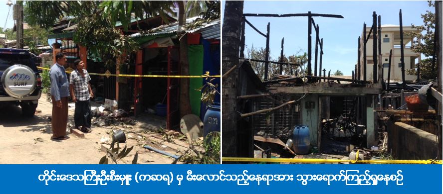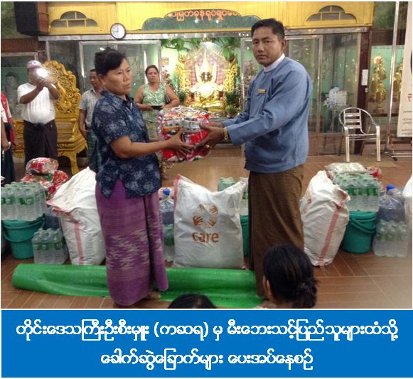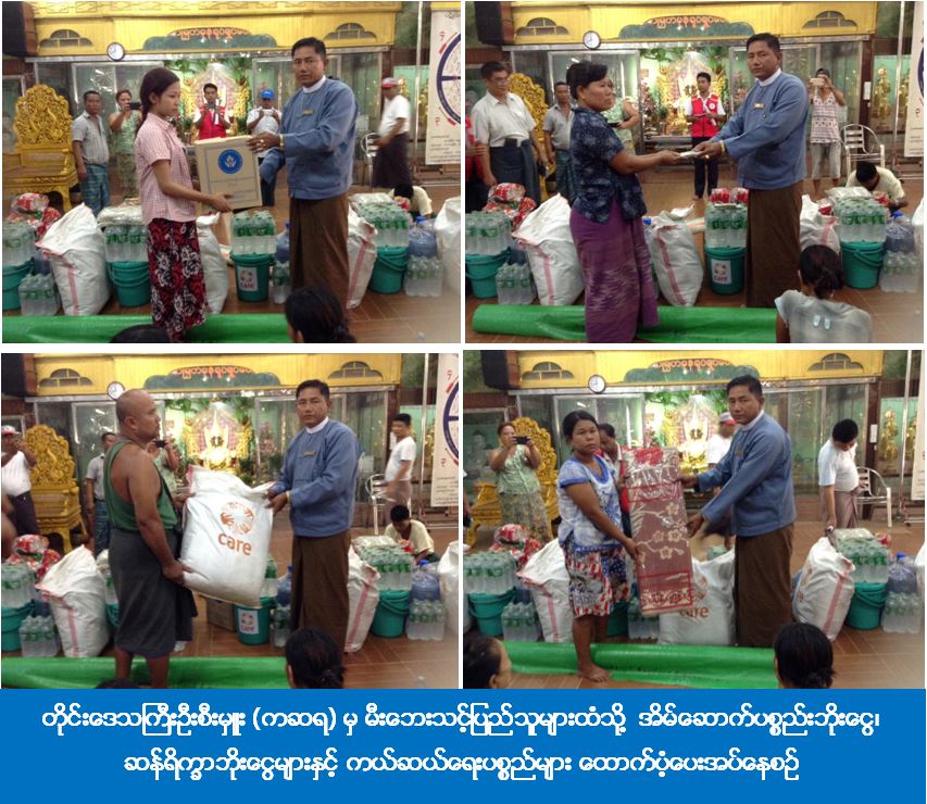 (၁၆-၅-၂၀၁၆) ရက်နေ့၊ နံနက်ပိုင်းအချိန်တွင် ရန်ကုန်တိုင်းဒေသကြီး၊ သာကေတမြို့နယ်၊ ၄/မြောက်ရပ်ကွက်၊ အောင်ဇေယျာလမ်းတွင် မီးလောင်မှုဖြစ်ပွားခဲ့ရာ သွပ်မိုး ပျဉ်ကယနေအိမ် (၄) လုံး မီးလောင်ကျွမ်းခဲ့ပြီး အိမ်ထောင်စု (၆) စုမှ လူဦးရေ (၂၃) ဦး မီးဘေးသင့်ခဲ့ပါသည်။ အဆိုပါမီးဘေးသင့်ပြည်သူများအတွက် ရန်ကုန်တိုင်းဒေသကြီးကယ်ဆယ်ရေးနှင့် ပြန်လည်နေရာချထားရေးဦးစီးဌာန၊ တိုင်းဒေသကြီးဦးစီးမှူးရုံးမှ အိမ်ဆောက်ပစ္စည်းဘိုးငွေကျပ် (၄၀၀၀၀၀) အားလည်းကောင်း၊ ဆန်ရိက္ခာဘိုးငွေကျပ် (၂၀၇၀၀) အား လည်းကောင်း၊ ကယ်ဆယ်ရေးပစ္စည်း (၉) မျိုး အိမ်ထောင်စု (၆) စုစာ၊ ပစ္စည်း (၂၂) မျိုးပါ Care Family Kit အိမ်ထောင်စု (၆) စုစာ၊ ခေါက်ဆွဲခြောက်၊ ရေသန့်၊ စားသုံးဆီနှင့် (၂၀) လီတာရေဘူးများအား လက်ဝယ်အရောက်ထောက်ပံ့ပေးခဲ့ပါကြောင်းနှင့် အောင်ဇေယျာလမ်းဓမ္မာရုံတွင် ကယ်ဆယ်ရေးစခန်းဖွင့်လှစ်ထားပါကြောင်း သိရှိရပါသည်။