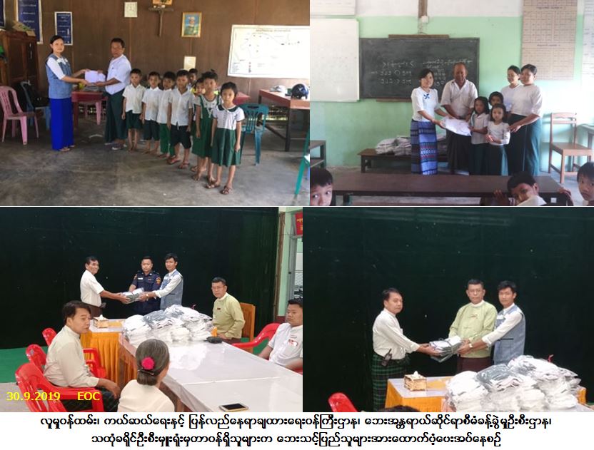 လူမှုဝန်ထမ်း၊ ကယ်ဆယ်ရေးနှင့် ပြန်လည်နေရာချထားရေးဝန်ကြီးဌာန၊ ဘေးအန္တရာယ်ဆိုင်ရာစီမံခန့်ခွဲမှုဦးစီး ဌာန၊ သထုံခရိုင်ဦးစီးမှူးရုံးမှတာဝန်ရှိသူများသည် ၂၀၁၉ခုနှစ်၊ သြဂုတ်လအတွင်း မွန်ပြည်နယ်၊ သထုံခရိုင် အတွင်း ရေကြီးရေလျှံမှုများကြောင့် ကယ်ဆယ်ရေးစခန်းသို့ ရွှေ့ပြောင်းခဲ့ရသည့် ပေါင်မြို့နယ်မှ ရေဘေးရှောင် ကျောင်းသား(၁၀၄)ဦးနှင့် ကျောင်းသူ(၉၅)ဦးတို့အတွက် ကလေးကျောင်းဝတ်စုံ စုစုပေါင်း(၁၉၉)ထည်ကို လည်းကောင်း၊ သထုံမြို့နယ်မှ ရေဘေးရှောင်ကျောင်းသား(၂၄)ဦးနှင့် ကျောင်းသူ(၃၀)ဦးတို့အတွက် ကလေးကျောင်းဝတ်စုံ စုစုပေါင်း(၅၄)ထည်ကိုလည်းကောင်း၊ ဘီးလင်းမြို့နယ်မှ ရေဘေးရှောင်ကျောင်းသား (၆၀၉)ဦးနှင့် ကျောင်းသူ(၅၆၅)ဦးတို့အတွက် ကလေးကျောင်းဝတ်စုံစုစုပေါင်း(၁၁၇၄)ထည်ကိုလည်းကောင်း (၃၀-၉-၂၀၁၉)ရက်နေ့တွင် ထောက်ပံ့ပေးခဲ့ပါကြောင်း သတင်းရရှိပါသည်။