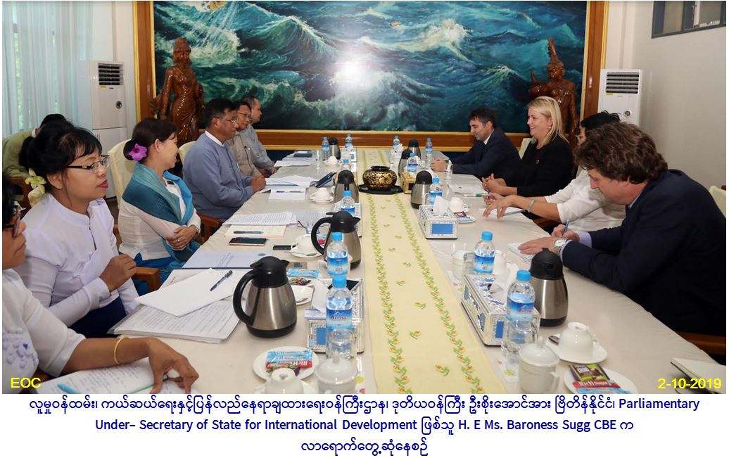 လူမှုဝန်ထမ်း၊ ကယ်ဆယ်ရေးနှင့်ပြန်လည်နေရာချထားရေး ဝန်ကြီးဌာန၊ ဒုတိယဝန်ကြီး ဦးစိုးအောင်အား ဗြိတိန်နိုင်ငံ၊ Parliamentary Under- Secretary of State for International Development ဖြစ်သူ H. E Ms. Baroness Sugg CBE က လာရောက်တွေ့ဆုံပါသည်။