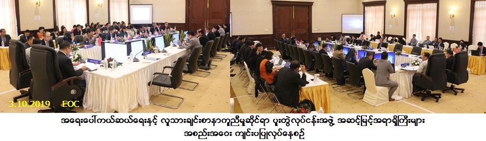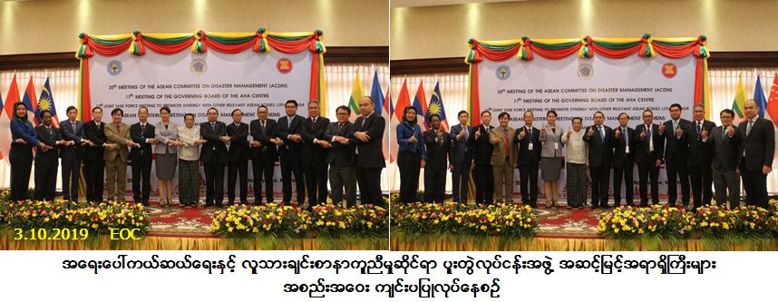 လူမှုဝန်ထမ်း၊ ကယ်ဆယ်ရေးနှင့် ပြန်လည်နေရာချထားရေးဝန်ကြီးဌာန၊ ဘေးအန္တရာယ်ဆိုင်ရာ စီမံခန့်ခွဲမှုဦးစီးဌာနသည် (၃၅) ကြိမ်မြောက် အာဆီယံသဘာဝဘေးအန္တရာယ် စီမံခန့်ခွဲမှုကော်မတီ အစည်းအဝေး၏ တတိယမြောက်နေ့အဖြစ် ယနေ့နံနက် (၉:၀၀) နာရီအချိန်တွင် ဆက်လက်ကျင်းပပြုလုပ်ရာ အာဆီယံသဘာဝဘေးအန္တရာယ်စီမံခန့်ခွဲမှု ကော်မတီ (ACDM) ၏ အလှည့်ကျဥက္ကဋ္ဌအဖြစ်၊ ဘေးအန္တရာယ်ဆိုင်ရာစီမံခန့်ခွဲမှုဦးစီးဌာန၊ ညွှန်ကြားရေးမှူးချုပ်၊ ဒေါက်တာကိုကိုနိုင်၊ ပူးတွဲဥက္ကဋ္ဌ ဖြစ်သူ Mr. Kistoffer James E. Purisima, Assistant Secretary/ Deputy Administrator for Administration, Philippines တို့ကဆောင်ရွက်ခဲ့ကြပါသည်။