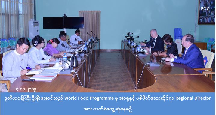 ထိုသို့တွေ့ဆုံရာတွင် ဝန်ကြီးဌာနနှင့် WFP တို့ပူးပေါင်း၍ မြန်မာနိုင်ငံအတွင်းသဘာဝဘေးအန္တရာယ် ကျရောက်သောနေရာများသို့ စားနပ်ရိက္ခာများ ထောက်ပံ့ကူညီပေးနေမှုများ၊ လူမှုဝန်ထမ်း၊ ကယ်ဆယ်ရေးနှင့် ပြန်လည်နေရာချထာရေးဝန်ကြီးဌာနအောက်ရှိ ဘေးအန္တရယ်ဆိုင်ရာစီမံခန့်ခွဲမှု ဦးစီးဌာန၏ သိုလှောင်ရုံများ အဆင့်မြှင့်တင်ပြုပြင်ပေးနေမှုများ၊ ဘေးအန္တရယ်ဆိုင်ရာစီမံခန့်ခွဲမှုသင်တန်းကျောင်းအတွက် နည်းပညာပိုင်း ဆိုင်ရာအထောက်အကူပစ္စည်းများ အကူအညီပေးနေမှုများ၊ သိုလှောင်ရုံများတွင် ကယ်ဆယ်ထောက်ပံ့ရေး ပစ္စည်းများ စနစ်တကျသိုလှောင်ထားရှိမှု စနစ်များဆိုင်ရာ သင်တန်းပို့ချပေးနေမှုများ၊ ဘေးအန္တရယ်ဆိုင်ရာ စီမံခန့်ခွဲမှုဦးစီးဌာနနှင့်ပူးပေါင်း၍ သဘာဝဘေးနှင့်ပတ်သက်ပြီး ကြိုတင်ပြင်ဆင်မှု၊ တုန့်ပြန်မှု၊ ထောက်ပံ့ ပို့ဆောင်မှုလုပ်ငန်းများအတွက် ရှေ့ဆက်ဆောင်ရွက်မည့်စီမံချက်များ ရေးဆွဲအကောင်အထည်ဖော်မည့် ကိစ္စရပ်များ၊ WFP အနေဖြင့် စားနပ်ရိက္ခာအပြင် ငွေကြေးထောက်ပံ့မှုအစီအစဉ်ပါ ဆောင်ရွက်ပေးနိုင်ရန် အတွက် စီမံနေမှုများနှင့်ပတ်သက်သည်များကို ရင်းနှီးပွင့်လင်းစွာ ဆွေးနွေးခဲ့ကြကြောင်း သတင်းရရှိပါသည်။
