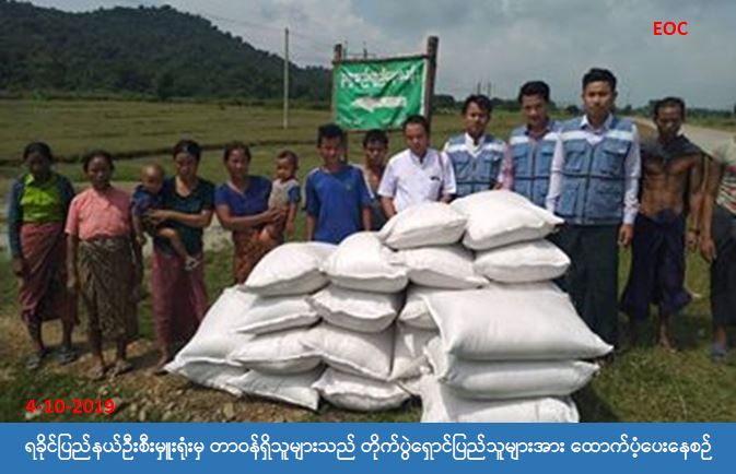 လူမှုဝန်ထမ်း၊ ကယ်ဆယ်ရေးနှင့် ပြန်လည်နေရာချထားရေးဝန်ကြီးဌာန၊ ဘေးအန္တရာယ်ဆိုင်ရာ စီမံခန့်ခွဲမှုဉီးစီး ဌာန၊ ရခိုင်ပြည်နယ်ဉီးစီးမှူးရုံးမှ တာဝန်ရှိသူများသည် ပုဏ္ဏားကျွန်းမြို့နယ်၊ ဗန်းဗွီးကျေးရွာရှိ တိုက်ပွဲရှောင် အိမ်ထောင်စု(၂၁)စု၊ လူဉီးရေ(၈၄)ဉီးတို့အတွက် ဆန်ရိက္ခာ(၁)လစာ(၂၆)အိတ်၊(၆)ပြည်တို့အား (၄-၁၀-၂၀၁၉) ရက်နေ့တွင် သွားရောက်ထောက်ပံ့ခဲ့ကြောင်း သိရှိရပါသည်။