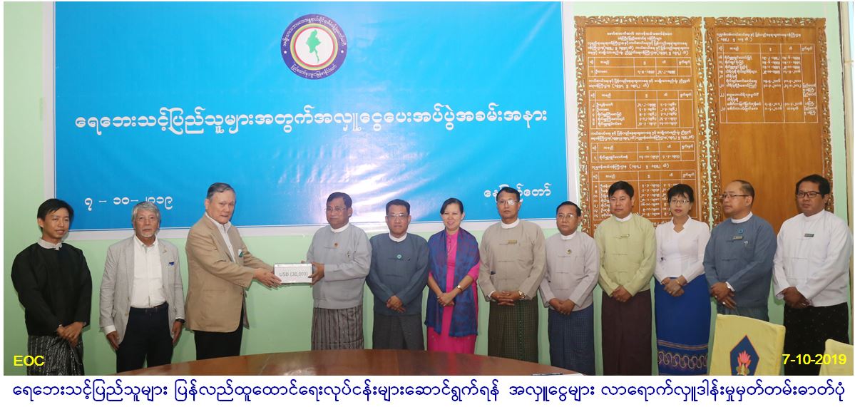 မြန်မာနိုင်ငံတွင်ဖြစ်ပွားခဲ့သော ရေကြီးရေလျှံမှုများနှင့် မြေပြိုမှုများကြောင့် ဘေးသင့်ဒေသများအတွက် လူသားချင်းစာနာထောက်ထားမှုနှင့် ပြန်လည်ထူထောင်ရေးလုပ်ငန်းများ ဆောင်ရွက်ပေးနိုင်ရန် Shigematsu Company Limited (Japan) က အမေရိကန်ဒေါ်လာ (၃၀,၀၀၀) ကိုလည်းကောင်း၊ လူမှုဝန်ထမ်း၊ ကယ်ဆယ်ရေးနှင့် ပြန်လည်နေရာချထားရေးဝန်ကြီးဌာန ပြည်ထောင်စုဝန်ကြီးရုံး ဝန်ထမ်းမိသားစုများက ငွေကျပ် (၁၈၂,၀၀၀) ကိုလည်းကောင်း၊ ပြန်လည်ထူထောင်ရေးဦးစီးဌာန ဝန်ထမ်းမိသားစုများက ငွေကျပ် (၁၂၈,၀၀၀) ကိုလည်းကောင်း ယနေ့နံနက်ပိုင်းတွင် လူမှုဝန်ထမ်း၊ ကယ်ဆယ်ရေးနှင့် ပြန်လည်နေရာချထားရေးဝန်ကြီးဌာန အစည်းအဝေးခန်းမ၌ ပေးအပ်လှူဒါန်းကြပါသည်။