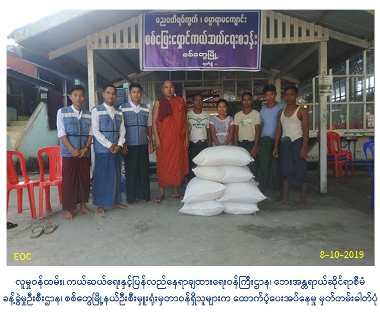 လူမှုဝန်ထမ်း၊ ကယ်ဆယ်ရေးနှင့်ပြန်လည်နေရာချထားရေးဝန်ကြီးဌာန၊ ဘေးအန္တရာယ်ဆိုင်ရာစီမံခန့်ခွဲမှုဦးစီးဌာန၊ စစ်တွေမြို့နယ်ဉီးစီးမှူးရုံးမှ တာဝန်ရှိသူများသည် (၃-၁၀-၂၀၁၉) ရက်နေ့တွင် စစ်တွေမြို့၊ ဓမ္မာရာမကျောင်း တိုက်သို့ ရသေ့တောင်မြို့နယ်၊ အငူမော်ကျေးရွာမှ ထပ်တိုးရောက်ရှိလာသော တိုက်ပွဲရှောင် အိမ်ထောင်စု (၂၂) စု၊ လူဦးရေ (၄၀) ဦးအတွက် ဆန်ရိက္ခာ (၂) ပတ်စာ၊ ဆန် (၅) အိတ်၊ ဆန် (၂၀) ပြည်အား (၈-၁၀-၂၀၁၉) ရက်နေ့၌ သွားရောက်ထောက်ပံ့ပေးအပ်ခဲ့ပါကြောင်း သတင်းရရှိပါသည်။