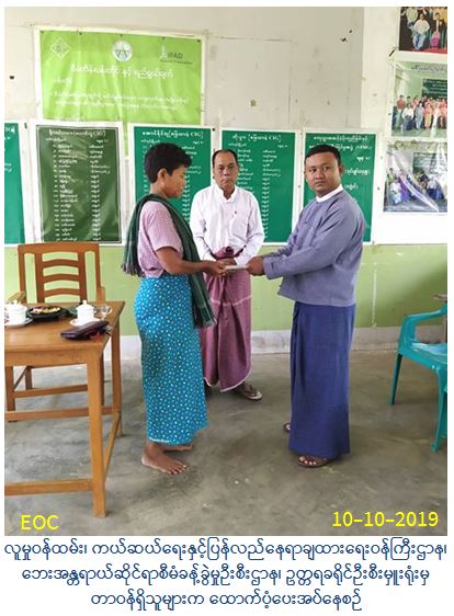 လူမှုဝန်ထမ်း၊ ကယ်ဆယ်ရေးနှင့်ပြန်လည်နေရာချထားရေးဝန်ကြီးဌာန၊ ဘေးအန္တရာယ်ဆိုင်ရာစီမံခန့်ခွဲမှုဦးစီးဌာန၊ ဥတ္တရခရိုင်ဉီးစီးမှူးရုံးမှတာဝန်ရှိသူများသည် (၈-၁၀-၂၀၁၉) ရက်နေ့ (၁ရး၀၀) နာရီအချိန်၌ ဖြစ်ပွားခဲ့သော တပ်ကုန်းမြို့နယ်၊ ရွေးစုကျးရွာအုပ်စု၊ ရွေးစုကျေးရွာမှ မိုးကြိုးဘေးကြောင့်သေဆုံးသူတစ်ဦးအတွက် ထောက်ပံ့ ငွေ (၃၀၀၀၀၀/-) ကျပ်အား (၁၀-၁၀-၂၀၁၉) ရက်နေ့ (၁၂:၀၀) နာရီအချိန်တွင် ထောက်ပံ့ပေးအပ်ခဲ့ပါကြောင်း သတင်းရရှိပါသည်။