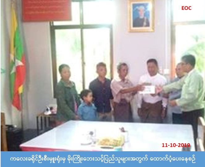လူမှုဝန်ထမ်း၊ ကယ်ဆယ်ရေးနှင့် ပြန်လည်နေရာချထားရေး ဝန်ကြီးဌာန၊ ဘေးအန္တရာယ်ဆိုင်ရာစီမံခန့်မှု ဦးစီးဌာန၊ ကလေးခရိုင်ဦးစီးမှူးရုံးမှ တာဝန်ရှိသူများသည် (၇-၁၀-၂၀၁၉) ရက်နေ့(၁၇:၀၀)နာရီအချိန်၌ ကလေးမြို့၊ရာဇဂြိုလ်ကျေးရွာတွင် ဘောလုံးကွင်းအတွင်း မောင်ထန်လမ်ပြောင်သည် အနားယူနေစဥ် မိုးကြိုးပစ်ခံရ၍ သေဆုံးသူတစ်ဦးတွက် ထောက်ပံ့ငွေ(၃၀၀,၀၀၀)ကျပ်ကို (၁၁-၁၀-၂၀၁၉)ရက်နေ့ (၀၈:၃၀)နာရီအချိန်တွင် ကလေးမြို့နယ်စီမံခန့်ခွဲမှုကော်မတီ ရုံးခန်း၌ အုပ်ချုပ်ရေးမှူးနှင့်အတူ ထောင်ပံ့ ပေးခဲ့ပါကြောင်း သတင်းရရှိပါသည်။