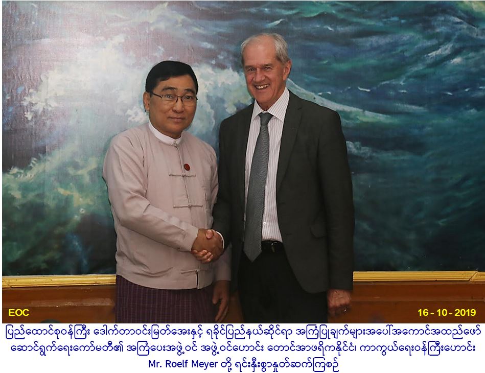 လူမှုဝန်ထမ်း၊ ကယ်ဆယ်ရေးနှင့် ပြန်လည်နေရာချထားရေးဝန်ကြီးဌာန ပြည်ထောင်စုဝန်ကြီး ဒေါက်တာဝင်းမြတ်အေး အား ရခိုင်ပြည်နယ်ဆိုင်ရာ အကြံပြုချက်များအပေါ် အကောင်အထည်ဖော် ဆောင်ရွက်ရေးကော်မတီ၏ အကြံပေးအဖွဲ့ဝင် အဖွဲ့ဝင်ဟောင်း တောင်အာဖရိကနိုင်ငံ၊ ကာကွယ်ရေး ဝန်ကြီးဟောင်း Mr. Roelf Meyer ဦးဆောင်သောအဖွဲ့က ယနေ့ နံနက်ပိုင်းတွင် အဆိုပါဝန်ကြီးရုံး မေခလာခန်းမ၌ လာရောက်တွေ့ဆုံပါသည်။