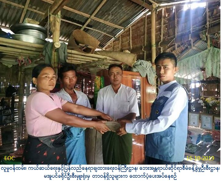 လူမှုဝန်ထမ်းကယ်ဆယ်ရေးနှင့်ပြန်လည်နေရာချထားရေးဝန်ကြီးဌာန၊ ဘေးအန္တရာယ်ဆိုင်ရာစီမံ ခန့်ခွဲမှုဦးစီးဌာန၊ မအူပင်ခရိုင်ဦးစီးမှူးရုံးမှတာဝန််ရှိသူများသည် မအူပင်ခရိုင်၊ ပန်းတနော်မြို့နယ်၊ ကဿ၀င်ကျေးရွာအုပ်စု၊ ရွှေဖလားကျွန်းကျေးရွာတွင် (၅-၁၀-၂၀၁၉) ရက်နေ့၌ ဖြစ်ပွားခဲ့သော ကမ်းပြိုဘေးကြောင့် ကြိုတင်ဖျက်သိမ်းပြောင်းရွှေ့နေအိမ် (၂၁) လုံး၊ အိမ်ထောင်စု (၂၁) စုမှ လူဦးရေ (၈၅) ဦးအတွက် အိမ်ဆောက်ပစ္စည်းဖိုး (၂၁၀၀၀၀၀) ကျပ် ၊ ဆန်ရိက္ခာ (၇) ရက်စာ (၁၇၈၅၀၀) ကျပ်၊ စုစုပေါင်းငွေ (၂၂၇၈၅၀၀) ကျပ်အား ကျေးရွာအုပ်ချုပ်ရေးမှူးနှင့်တကွ ဘေးသင့်ပြည်သူများ၏ လက်ဝယ်သို့အရောက် (၁၆-၁၀-၂၀၁၉) ရက်နေ့ (၁၃:၀) အချိန်၌ ထောက်ပံ့ပေးအပ်ခဲ့ပါကြောင်း သတင်းရရှိပါသည်။